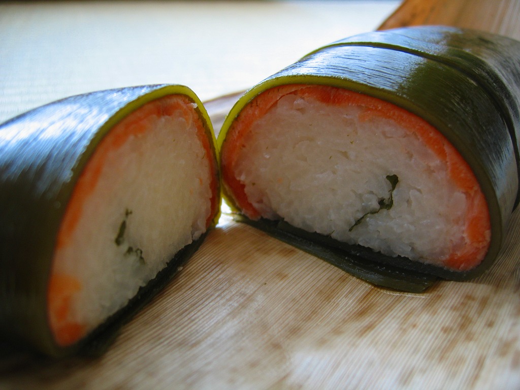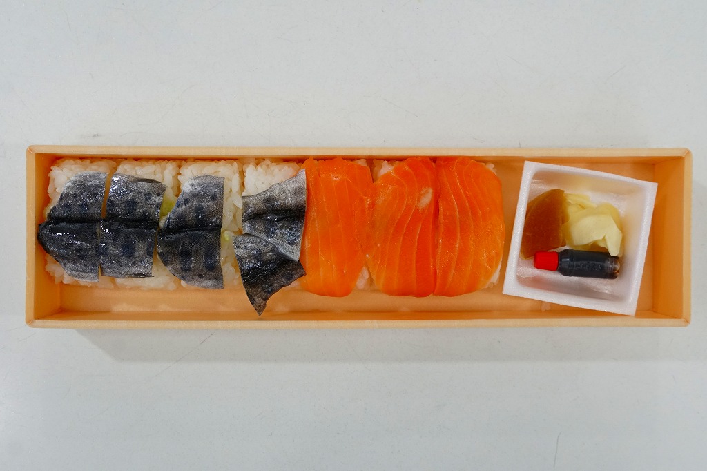 みずから「おみやげ駅弁」を名乗る変わり者。竹皮に包んだ棒寿司を紙箱に詰める。中身は大葉を含む棒状酢飯を鮭の身で巻き、さらに厚めの真昆布で巻く。