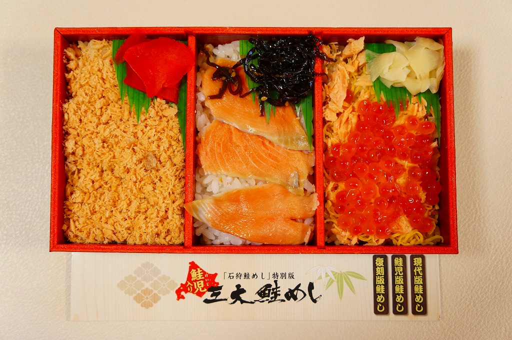 3区画に仕切られた中身は、左に鶏ガラ飯を空煎りの焼き鮭で覆い紅生姜を添える「復刻版鮭めし」、右に昆布茶飯を醤油ダレで炊いた焼き鮭とイクラで覆いガリを添える「現代版鮭めし」、中央に白飯に鮭児の酢締めを3枚貼って昆布を添える「鮭児版鮭めし」。つまり、下の「石狩鮭めし今昔物語」に、鮭児版を追加したようなもの。