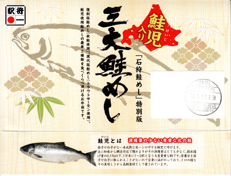 今と昔と催事を並べた新商品、記念商品には感心するし、鮭児の酢締めは鮭児だと念じて食べれば脂の乗りを感じるが、おそらく客に相応の知識と味覚を求めるハードルの高さで、具体的にはケイジケイジと騒いでも客がついてこられず、見た目にほとんど売れていなかった。各日500食×2週間分の鮭児の調達の苦労話が、駅弁大会の頃にテレビで取り上げられていたと思うが、会期の終了後は逆の苦労話が生まれてしまったかもしれない。なお、札幌駅では予約販売に応じていた模様。