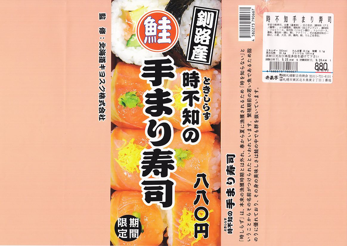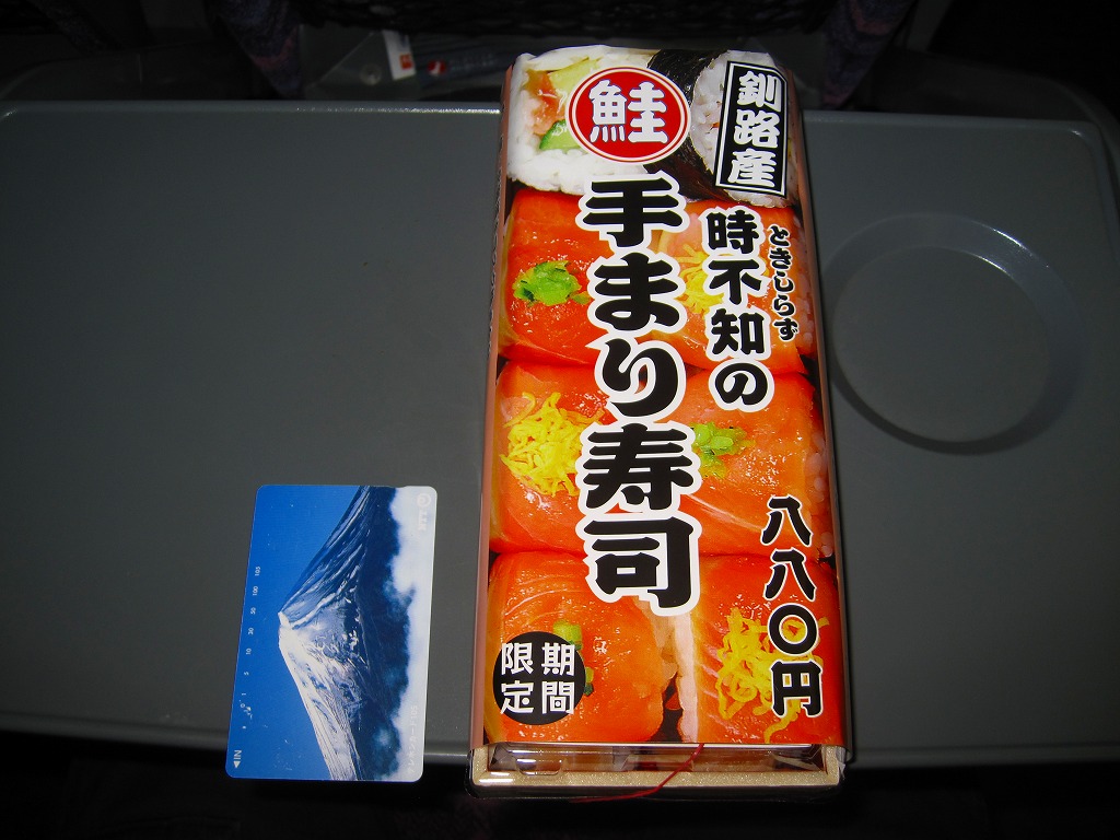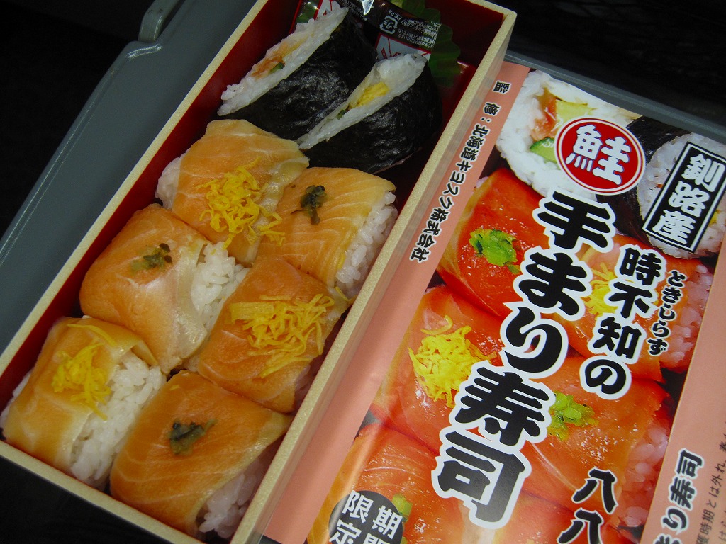 細長い長方形の容器に透明なふたをして、中身の写真を美しく印刷した掛紙を巻く。中身は手まり鮭寿司が6個と、鮭と玉子焼ときゅうりを巻いた太巻きが2切れ。調製元は札幌駅の駅弁屋なのに、外観、内容、風味とも札幌駅弁の雰囲気はなく、鮭は回転寿司で流れるサーモンのような水っぽさがあり、手まり寿司は球形になり切れていない。名物ではなく、軽食であればOK。