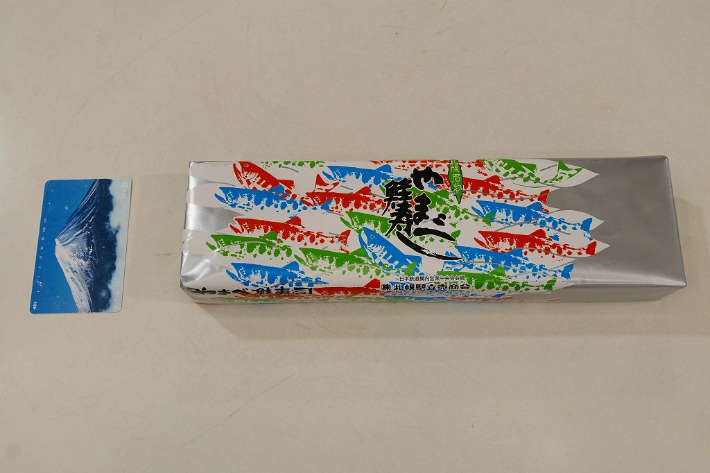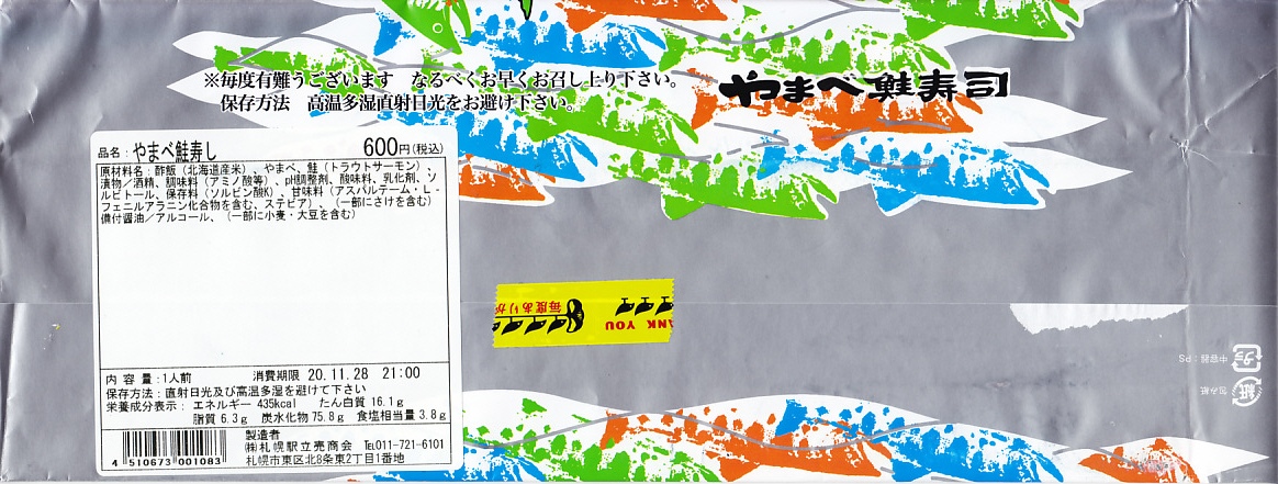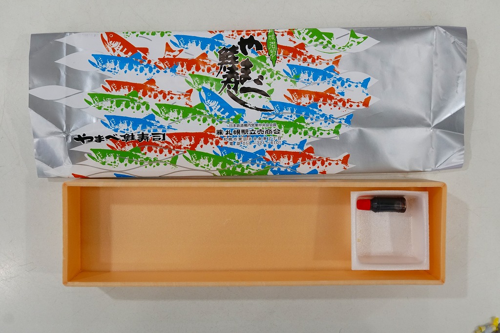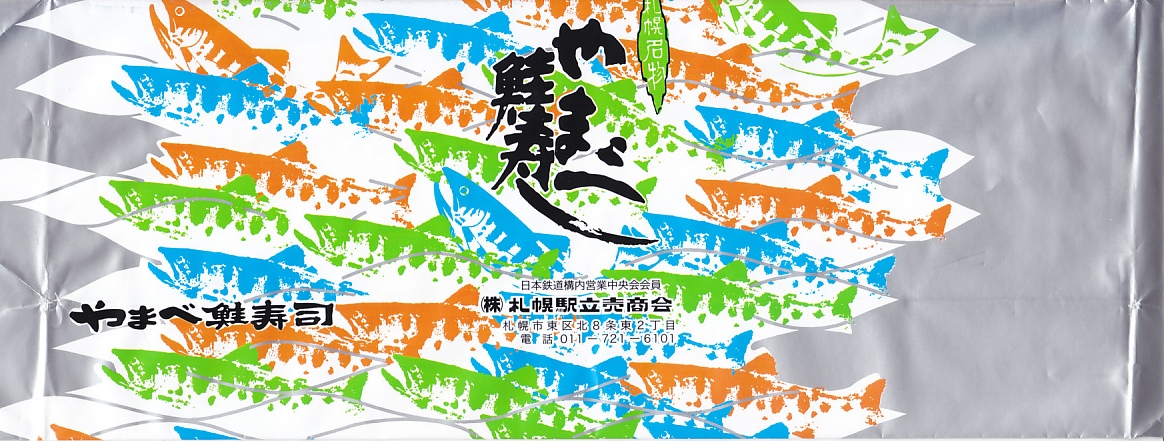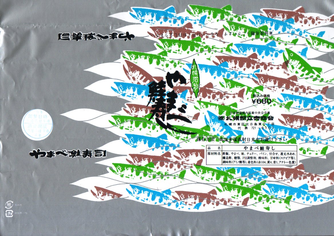 1969(昭和44)年の発売。札幌駅で半世紀の歴史を刻んだ、伝統の駅弁。細身の折箱を包む包装紙の、銀地に多数の魚拓が泳ぐ絵柄も、また半世紀変わらないものか。中身は小柄なやまべ(ヤマメ)寿しが4切れと鮭寿しが3切れに、ガリと奈良漬が少々。今時に珍しい、ワサビ入りの商品である。小食や小腹かおつまみに最適。価格は2004年時点で680円、2009年時点で700円、2014年時点で中身からやまべ1個とパインとチェリーを削り600円、2023年時点で680円、2024年時点で750円、11月から780円。