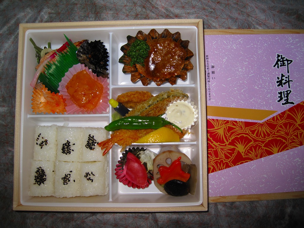 大阪発札幌行の寝台特急列車「トワイライトエクスプレス」で食べた、夕食向けに列車内で予約を取りに来る注文弁当。大きな正方形の容器を使用、これにセロテープで掛紙を貼り、風呂敷で包む。中身は俵飯、ミニハンバーグ、海老やカボチャなどのフライ、レンコンやサトイモなどの煮物、焼き鮭、ひじき、山菜、ゼリーなど。素材良好、分量もやや多めな、上質感のある仕出し弁当。