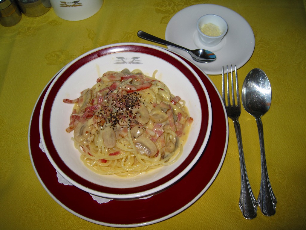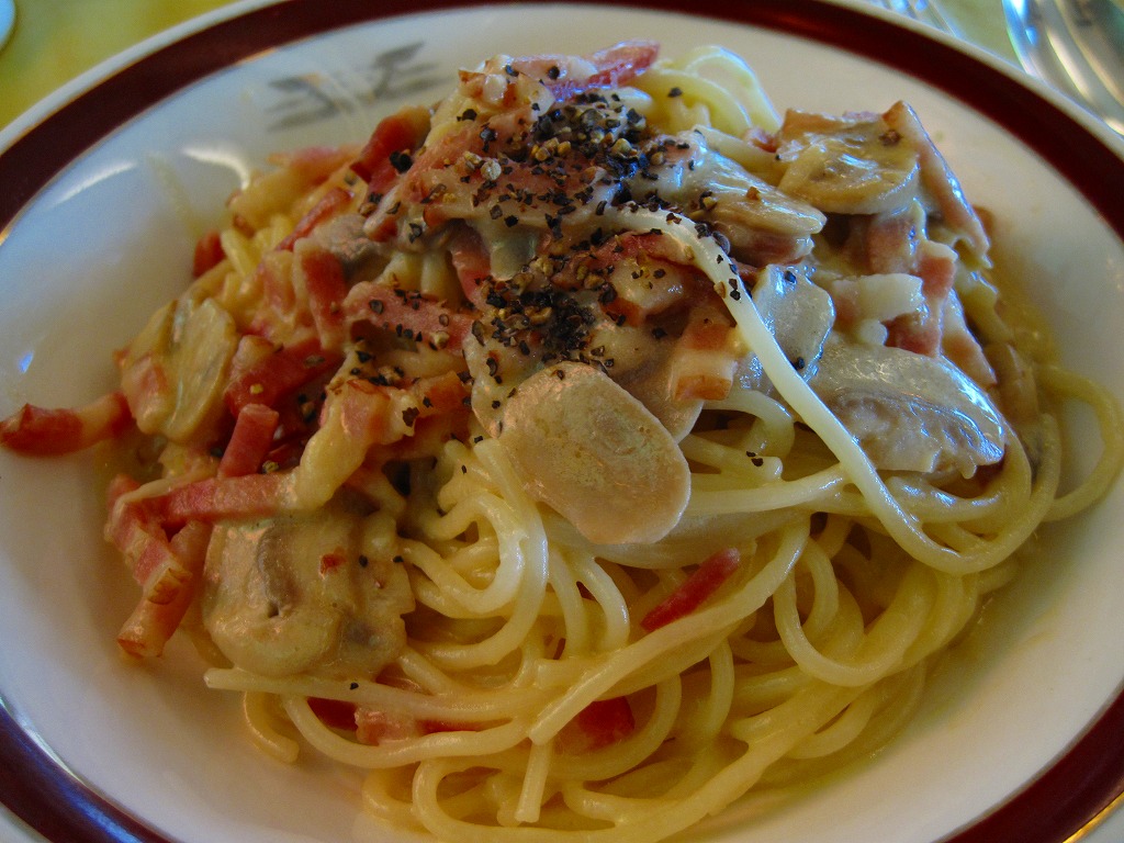 大阪発札幌行の寝台特急列車「トワイライトエクスプレス」のランチメニューで食べた昼食。注文するとスパゲティカルボナーラに加えて、ソーサー付きで粉チーズが運ばれてくる。麺の量は控えめ、ベーコンたっぷり、マッシュルームもたっぷり、クリーム感もたっぷりな、高級カルボナーラ。そんな体験も、2015年3月13日限りの列車の廃止により過去帳入りした。