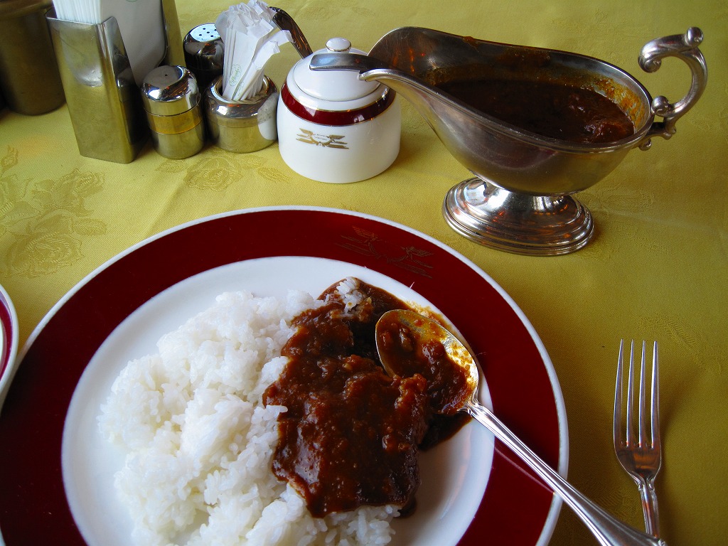 大阪発札幌行の寝台特急列車「トワイライトエクスプレス」のランチメニューで食べた昼食。注文すると、平皿の白御飯と、小皿のザワークラウトと、金属製カレーポットのビーフカレーが、それぞれ運ばれてくる。辛さは控えめ、コクは強め、ビーフの分量と風味はほどほどに感じた。