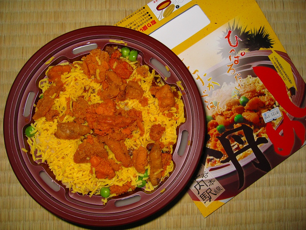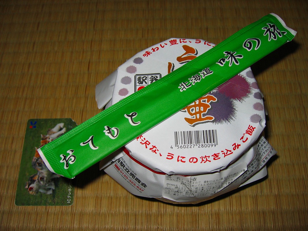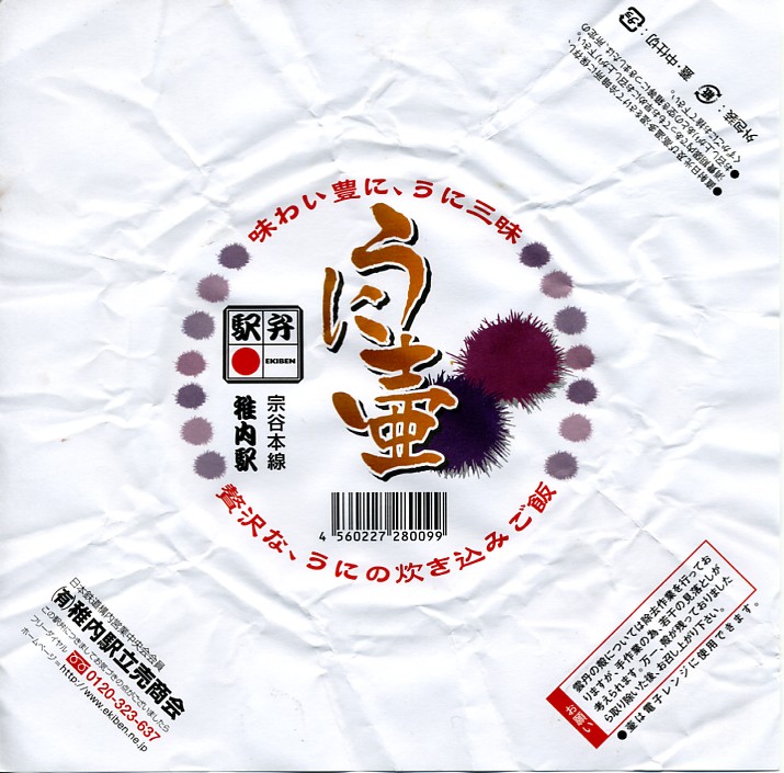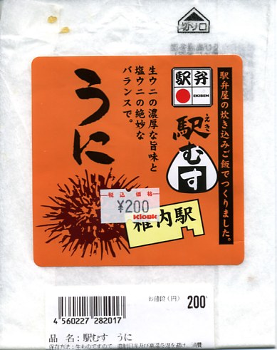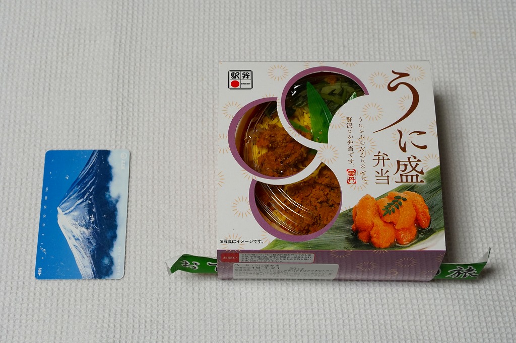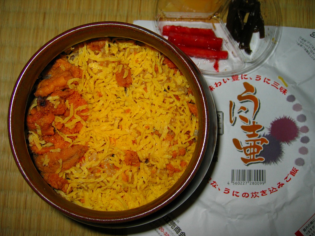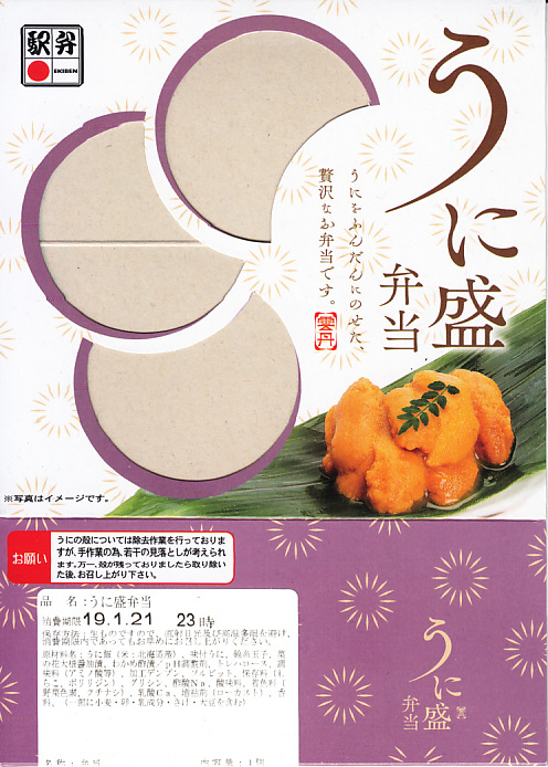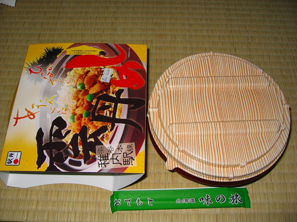 円形の加熱機能付き容器を、中身の写真を美しく載せて商品名と駅名を大書きしたボール紙の枠にはめる。中身は醤油飯の上に錦糸卵を敷いて蒸しウニとグリーンピースを散らす、ありがちなウニ弁当。風味は見た目どおり。