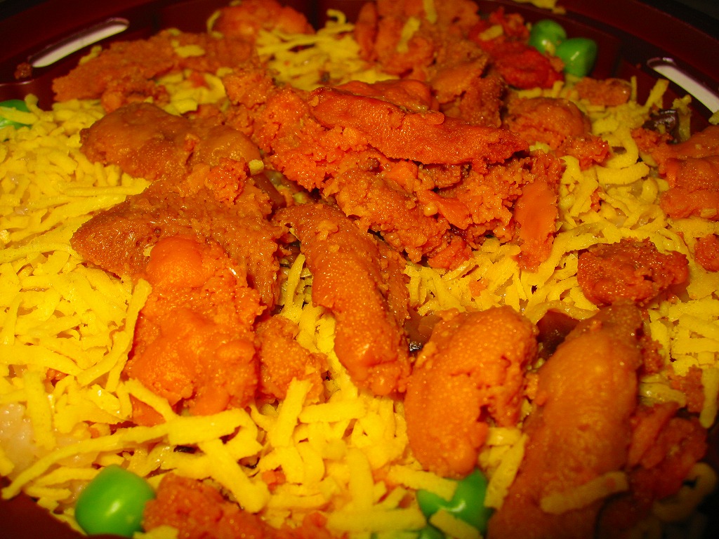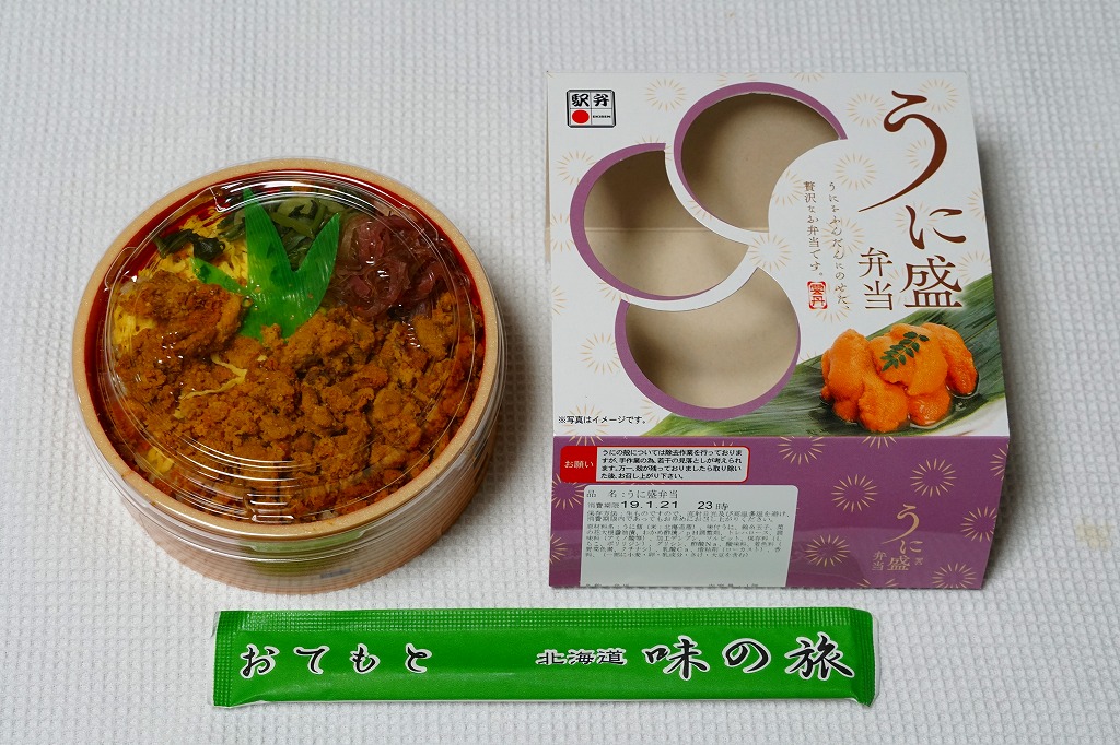2017(平成29)年夏の発売か。丸い容器にウニ飯を詰め、蒸しウニ、錦糸卵、ワカメ酢漬け、小松菜醤油漬で覆う。つまり人気の稚内駅弁「うに壷」とほぼ同じ中身であり、味も同じようなもの。蒸しうにそぼろの分量は、こちらのほうが多い気がした。2020年に終売か。