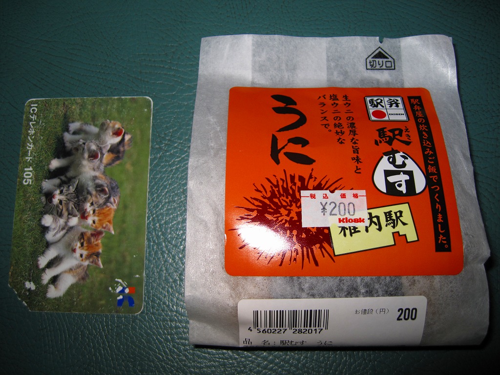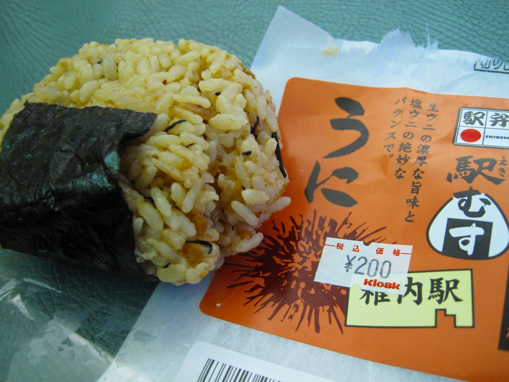 2009(平成21)年に「稚内駅 うに」「根室駅 炒りズワイ蟹」「洞爺駅 ほたて」「釧路駅 炒りズワイ蟹」の4種が誕生か。外見も中身も内容も、全国のコンビニエンスストアで見掛けるような高級高額おにぎりで、「うに」と書いてあるから御飯にウニの混ぜ御飯を使っている。味もコンビニと同等な印象。