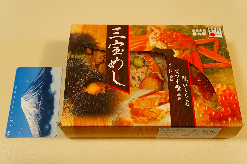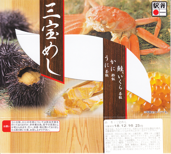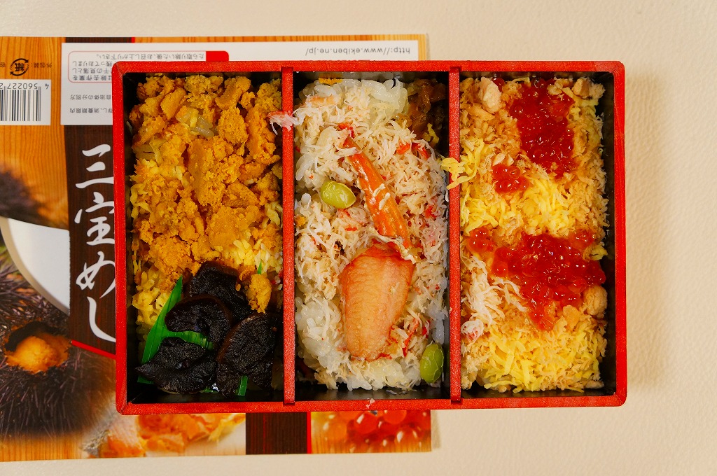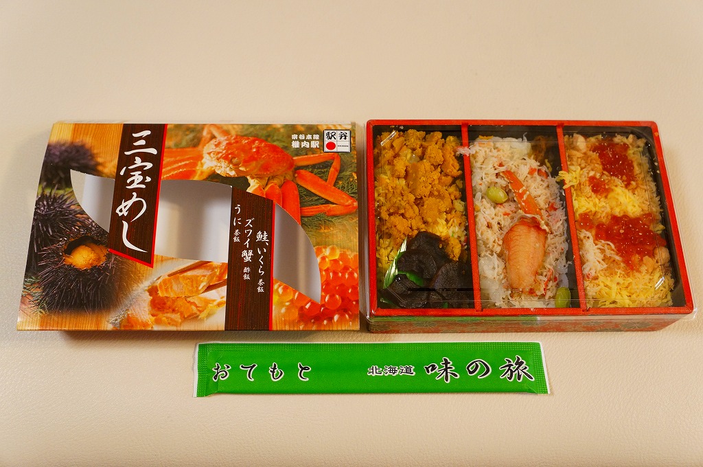 秋冬の駅弁大会シーズンに向けた、2012(平成24)年の秋頃の発売か。容器を3区画に仕切り、茶飯に蒸しウニとガリを載せるウニ丼、酢飯をズワイガニの爪とほぐし身で覆うカニ丼、茶飯を鮭フレークとイクラ醤油漬と錦糸卵で覆う鮭いくら丼を詰める。「宝」を名乗るような豪華さまでは持たないものの、分かりやすい味と内容。今回は東京駅で買ったが、レシートの表記は不思議と「三宝めし旭川」で、稚内駅でない駅名が記された。価格は2018年の購入時で1,180円、2021年時点で1,280円。2021年の春頃に終売か。