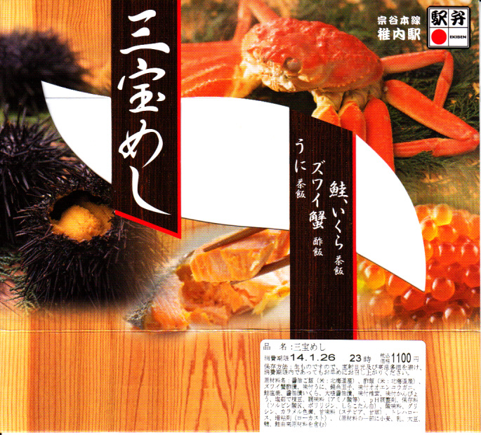 2014(平成26)年1月26日に購入した、稚内駅弁のスリーブ。上記の約5年後のものと比べて、中身のガリが奈良漬がだったくらいの変化しかないが、記載事項をよく見比べると、かにが「ズワイ蟹」だったり、写真はイメージだとか電子レンジ不可だとかの注意書きが当時になく、逆に駅名の表記があった。