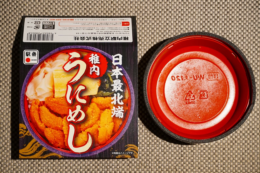秋冬の駅弁大会シーズンに向けた、2024(令和6)年秋の新商品か。黒くて丸い容器に醤油飯を詰め、ウニと玉子焼と菜の花と甘酢生姜で覆い、その中身の写真を使うスリーブに収める。「稚内」の文字が見えなければ、旭川駅か八戸駅かかつての釧路駅か、どこのものかわからないと思う催事向け商品。主に秋冬の全国各地のスーパーマーケットで売られるが、稚内駅の商業施設でも輸送販売され、いずれも旭川で作っている。