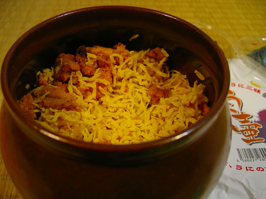 2007(平成19)年6月付けで新商品として旭川駅立売から発表され、2007〜2008年の駅弁大会シーズンにスーパーの駅弁催事で人気を集めた、収穫当時は稚内駅を代表する疑義駅弁。壷型というには丸みのある陶製容器に透明なふたをして、商品名を書いた掛紙をかけて輪ゴムでしばる。中身はウニとひじきの炊込飯に錦糸卵と蒸しウニをふりかけ、その上に透明なトレーで梅ごぼう、いも茎、生姜酢漬を添えて、刻み海苔を付ける。