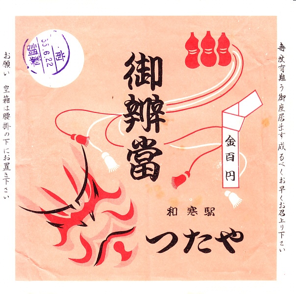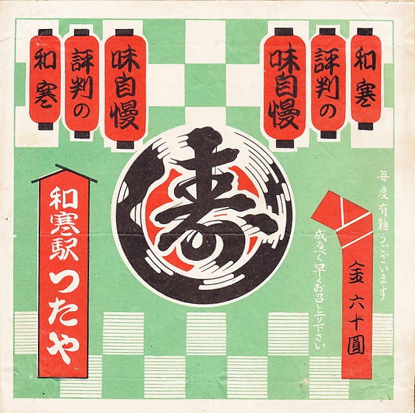 1950年代、昭和30年代のものと思われる、昔の和寒駅弁の掛紙。中身は当時に全国各地で普通の駅弁であった、助六寿司ではないかと思う。