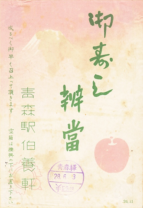 1953(昭和28)年6月3日の調製と思われる、昔の青森駅弁の掛紙。駅弁の世界では、お寿司つまり助六寿司と、お弁当つまり幕の内弁当を、厳格に分類していたはずなので、この「お寿し弁当」とはどんなものだったのかと思う。調製印に価格を入れ、合理的にできている。
