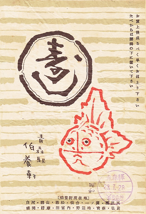 1953(昭和28)年7月28日の調製と思われる、昔の青森駅弁の掛紙。収集者が調製印に「昭和」と書き加えた。青森の金魚ねぶたを描く。山口県柳井の金魚ちょうちんにそっくりなのは、江戸時代の青森や弘前にあった金魚ねぶたを、江戸時代末期に柳井の商人である熊谷林三郎がヒントにして制作したと伝わるから、津軽のほうが元祖だといえる。