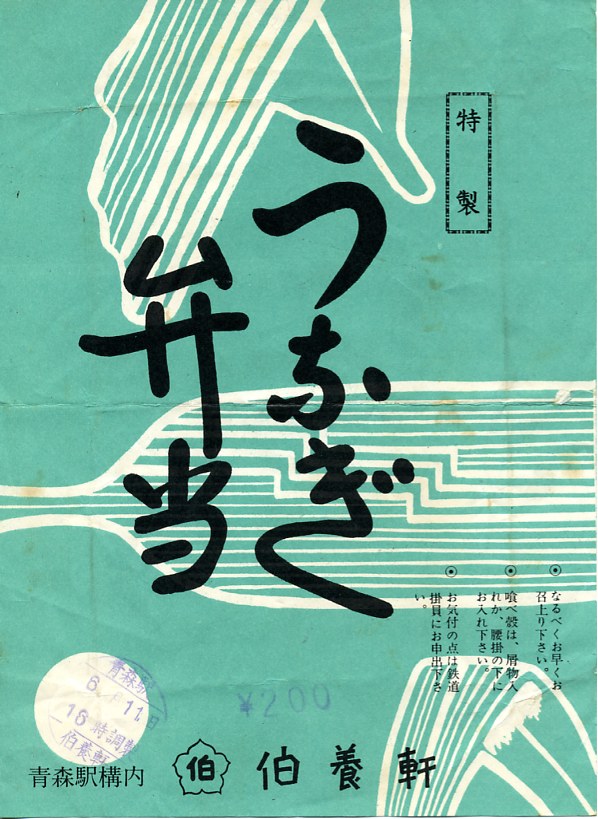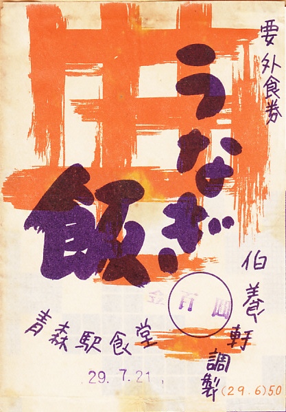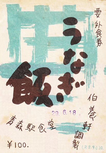 1954(昭和29)年7月21日の調製と思われる、昔の青森駅弁の掛紙。「うなぎ飯」「要外食券」「青森駅食堂」「伯養軒調製」と、必要最小限の事柄を文字で記した。