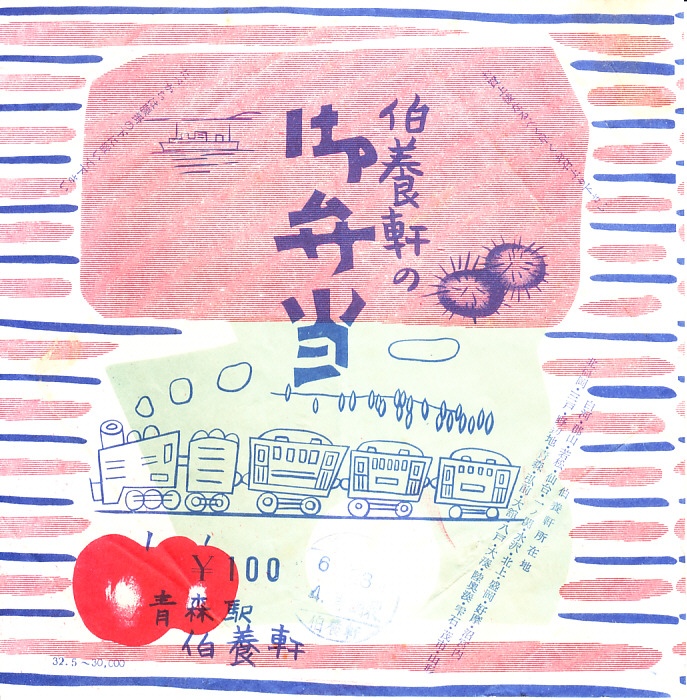 1957(昭和32)年6月28日の調製と思われる、昔の青森駅弁の掛紙。船とウニにリンゴと楽しい汽車の絵柄。調製元は東北地方一帯に20箇所以上の営業所を持っていたが、この掛紙では「青森駅」と明記した。