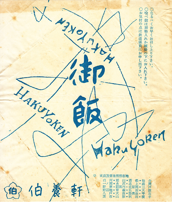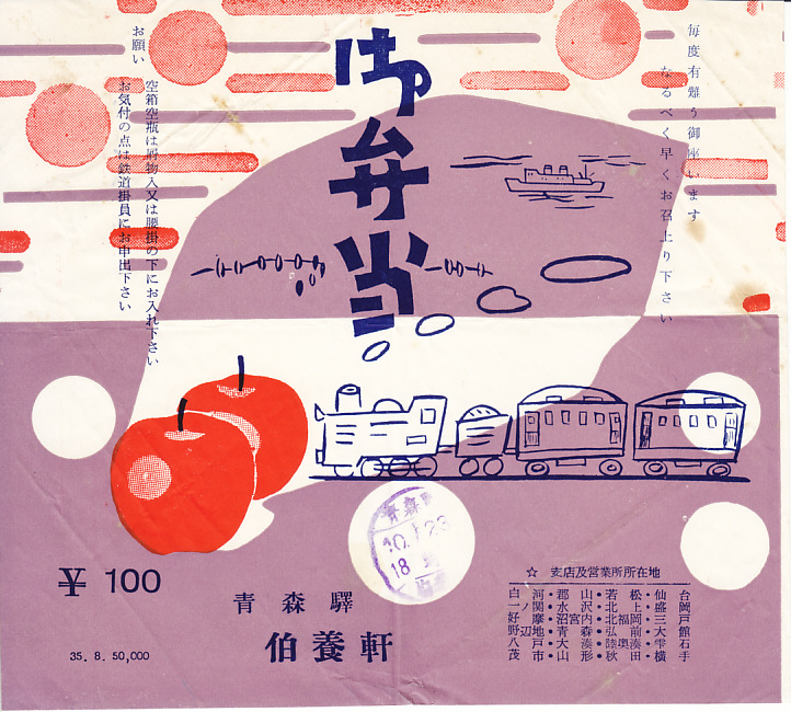 1960年代、昭和35年前後の、10月23日18時の調製と思われる、昔の青森駅弁の掛紙。おかずの掛紙の左下に「35.8 50,000」とあり、1960(昭和35)年8月に5万枚を刷った掛紙と読めるがどうか。右下には24箇所の支店や営業所の所在地を列記した。このすべてが駅弁販売駅ではないだろうが、今となっては雫石や茂市あたりの小さな駅にも伯養軒があったことに驚かされる。