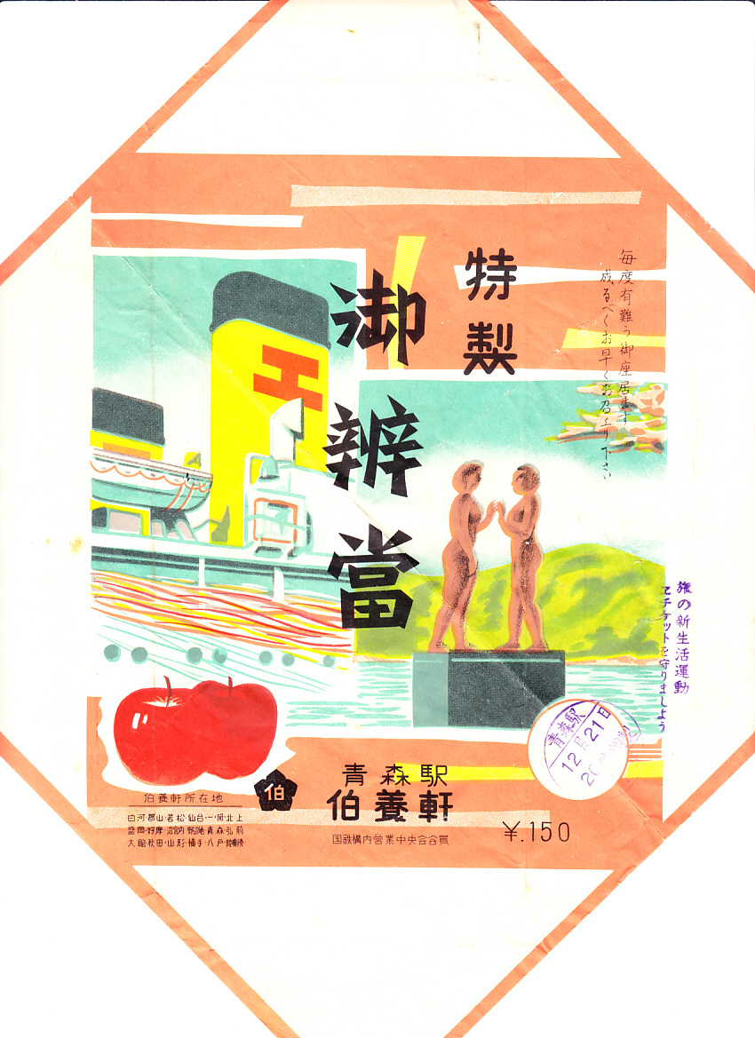 1960年代の調製と思われる、昔の青森駅弁の掛紙。左に青函連絡船のファンネルマークを、右に十和田湖と乙女の像を、左下にリンゴを描く、当時の青森駅らしい絵柄。
