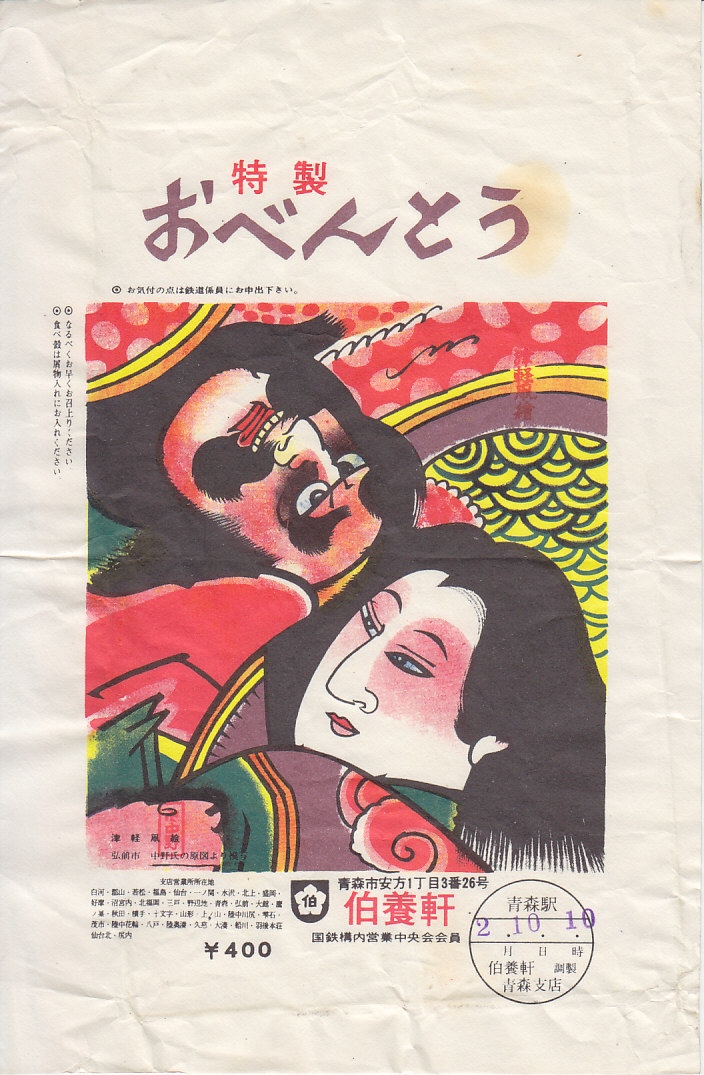 1970年代の、2月10日10時の調製と思われる、昔の青森駅弁の掛紙。絵柄は上記の昭和50年代の「特製おべんとう」と同じ。