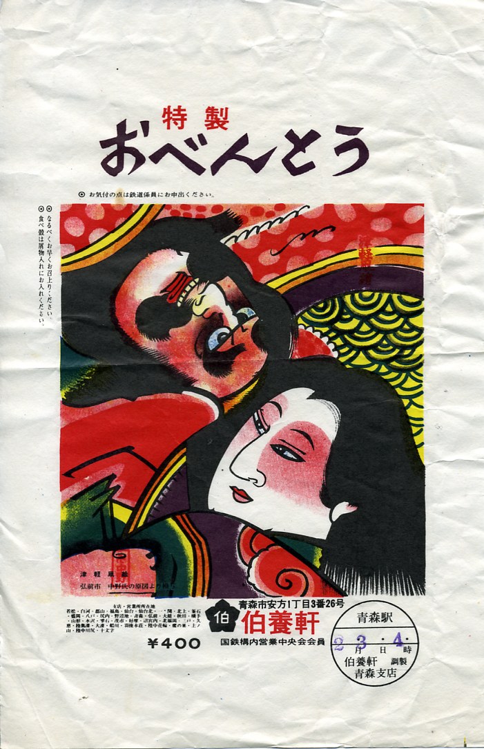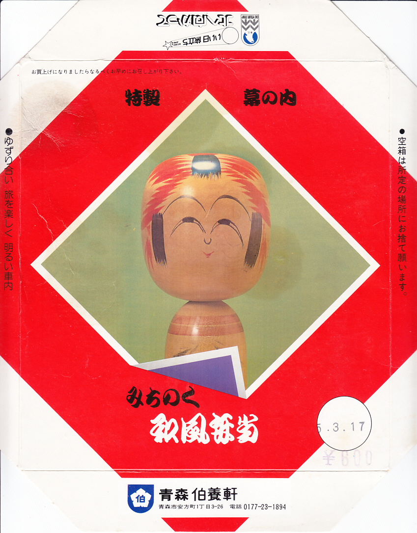 1980年代のものと思われる、昔の青森駅弁の掛紙。昭和時代後半の東北地方は、こけしの大ブーム。遠刈田系だ南部系だと分類や分析が格調高く語られ、東北各地にこけしの絵柄や容器を使う駅弁が出現し、20世紀中に霧散した。これはつまり特製幕の内弁当で、掛紙をよく見るとそう書いてある。