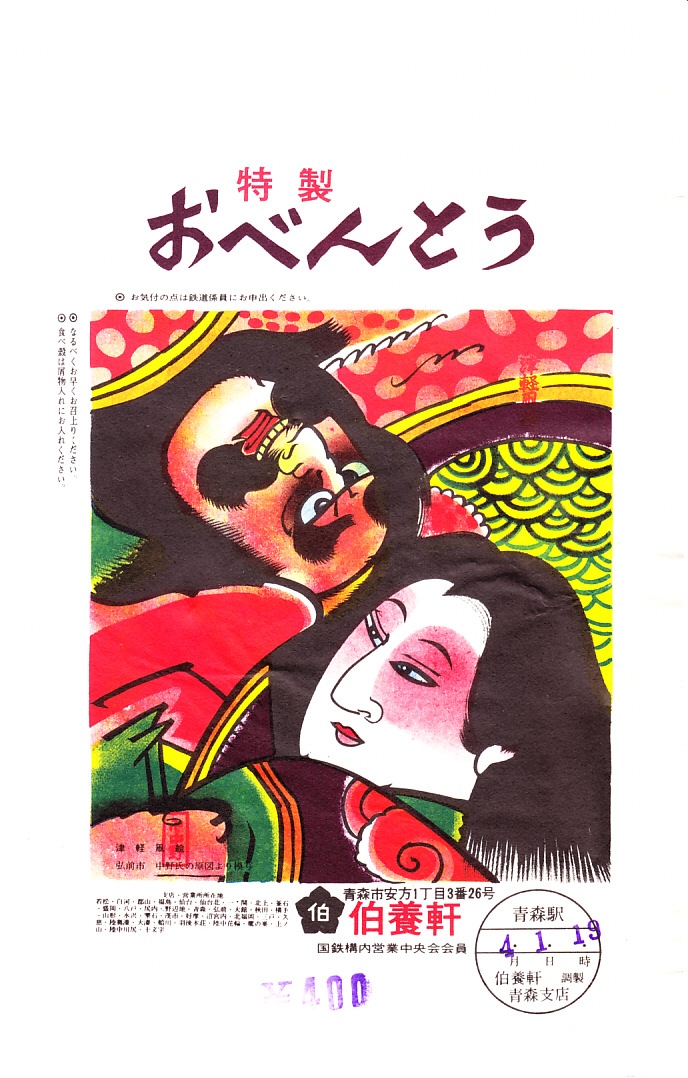 1976(昭和51)年4月1日19時の調製と思われる、昔の青森駅弁の掛紙。下記のものと同じく、「津軽凧絵 弘前市 中野氏の原図より模写」という絵柄を大きく載せる。