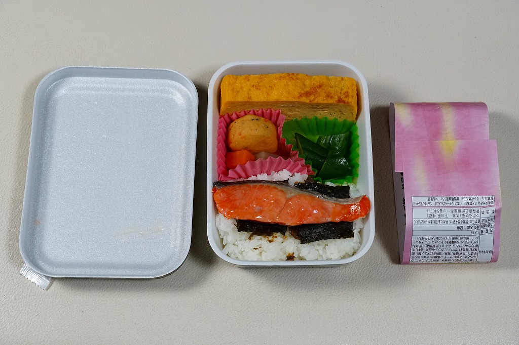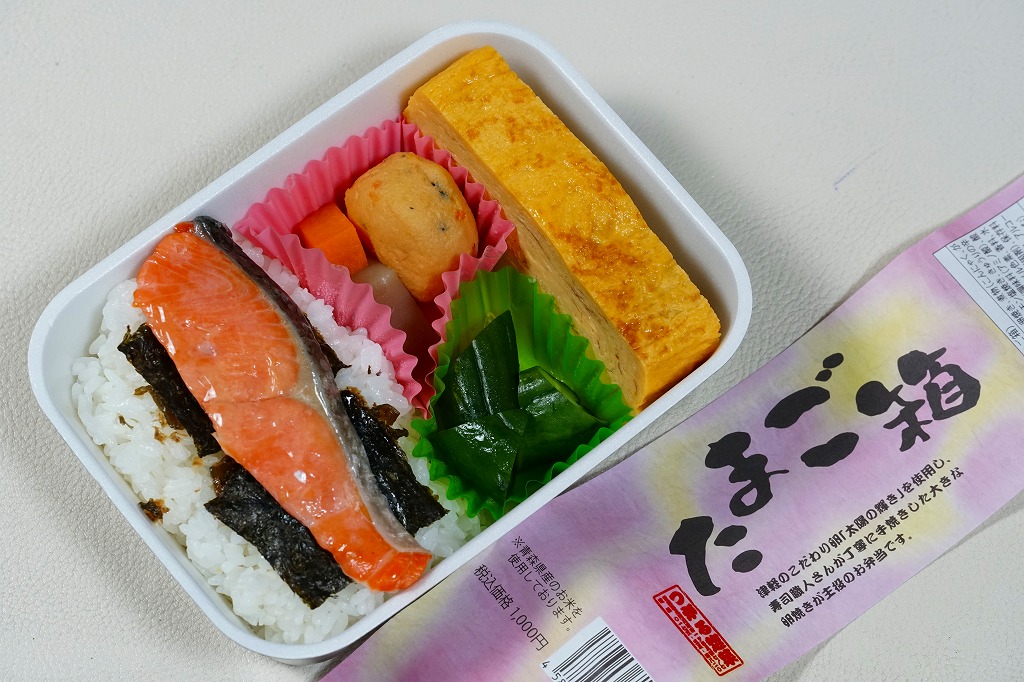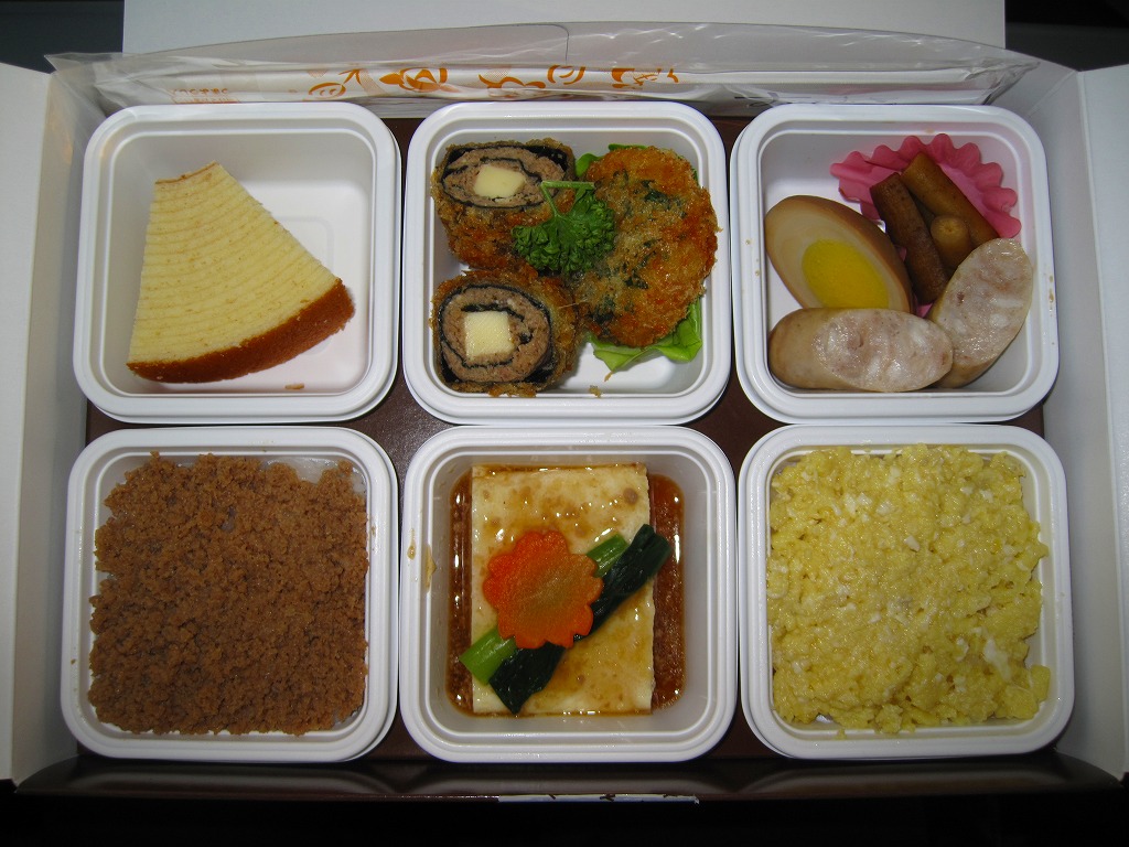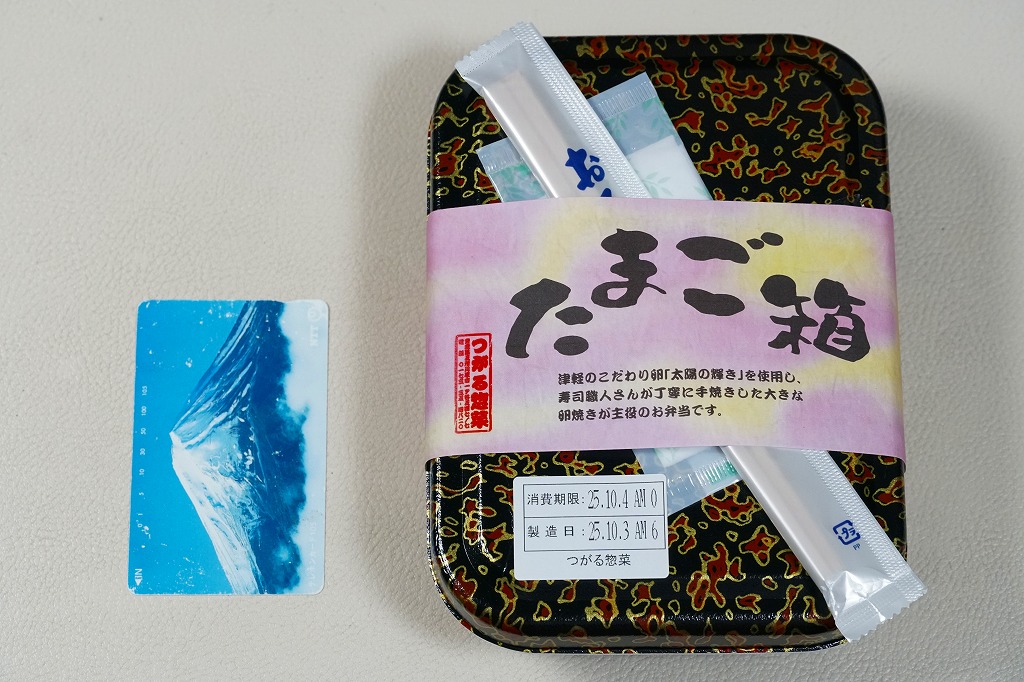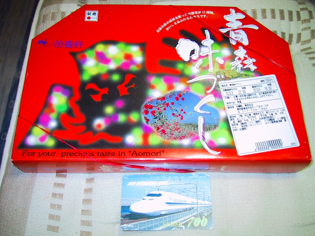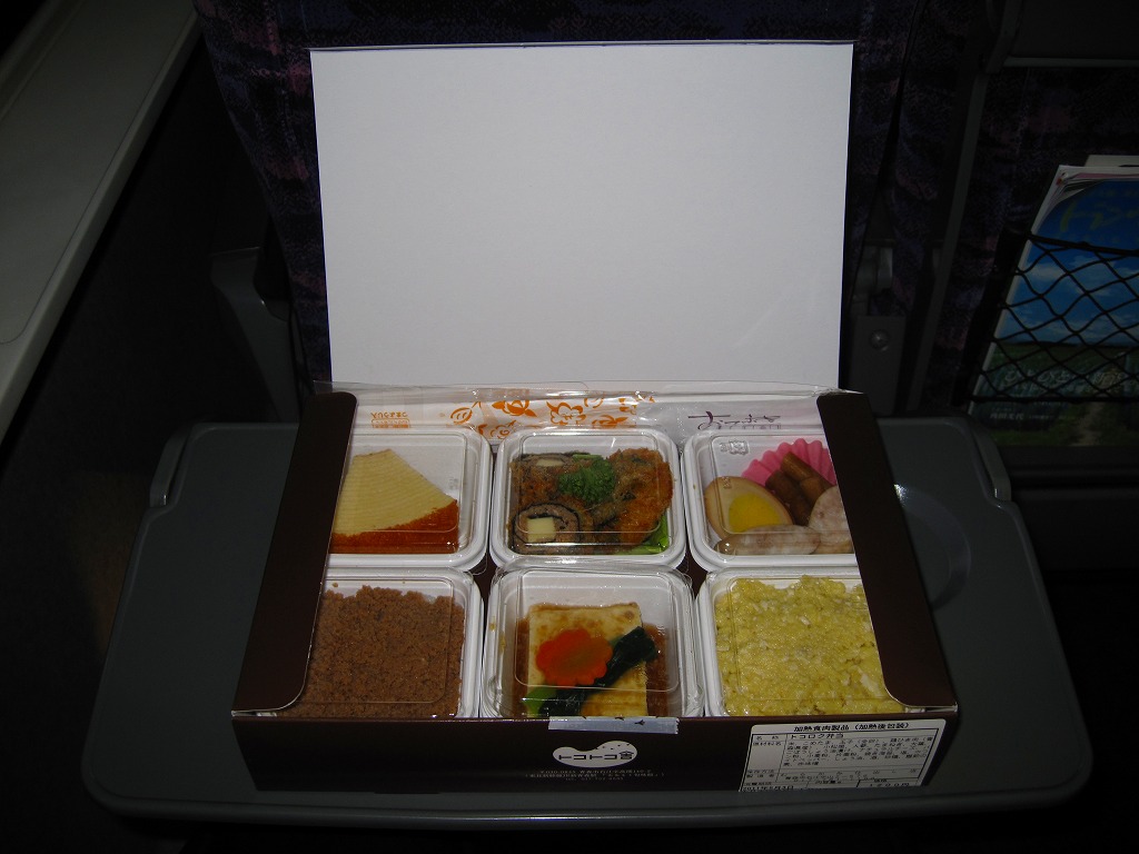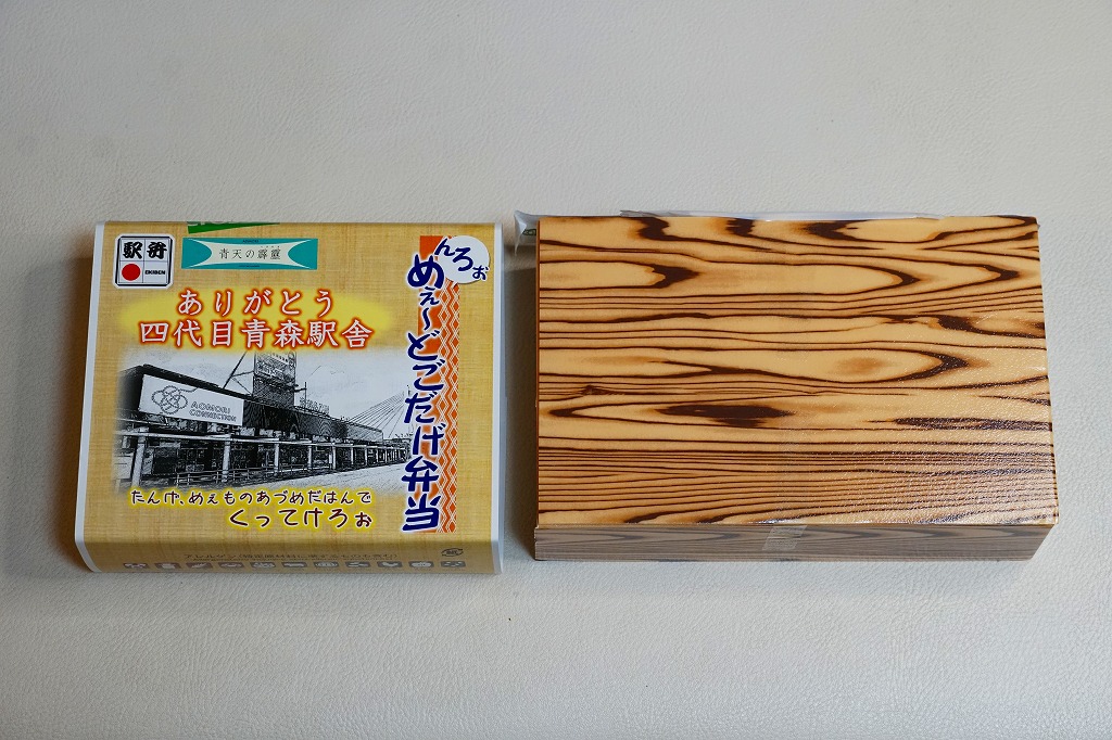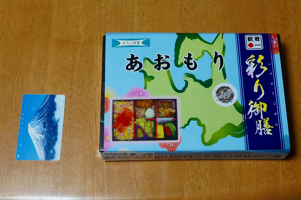 2010(平成22)年12月4日の東北新幹線新青森駅開業と同時に発売か。弁当名を描いた船用のボール紙箱を使用、6つの白いプラ製の惣菜容器に収まる中身はそれぞれ、鶏そぼろめし、玉子そぼろめし、豆腐のような玉子焼、チーズと鶏挽肉を大葉で巻いた揚げ物、ソーセージと煮玉子とごぼう、バームクーヘン。価格も見栄えも東京のデパ地下を目指したような、高くておしゃれな内容だと思う。食品表示ラベルには1,200円とあるが、現地では1,050円で掲示し販売されていた。一年間ほどの販売か。