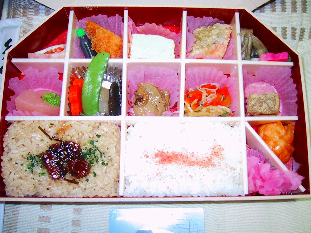 長方形から角をふたつ落とした、独特な形状の大きめの容器は内部で細分化されている。白飯と茶飯の2種の御飯、青森県産素材の小ぶりな帆立・厚焼玉子・とんかつロール・いかめしなどに、デザートがりんご煮ともう1種。いずれも味も風味も抜群で、さすがは味の伯養軒、という作品。このタイプの駅弁にはお品書きが欲しいところ。価格は2002年の購入時で1,000円、2017年時点で1,050円。調製元の青森からの撤退により、2019年9月までに終売のはず。