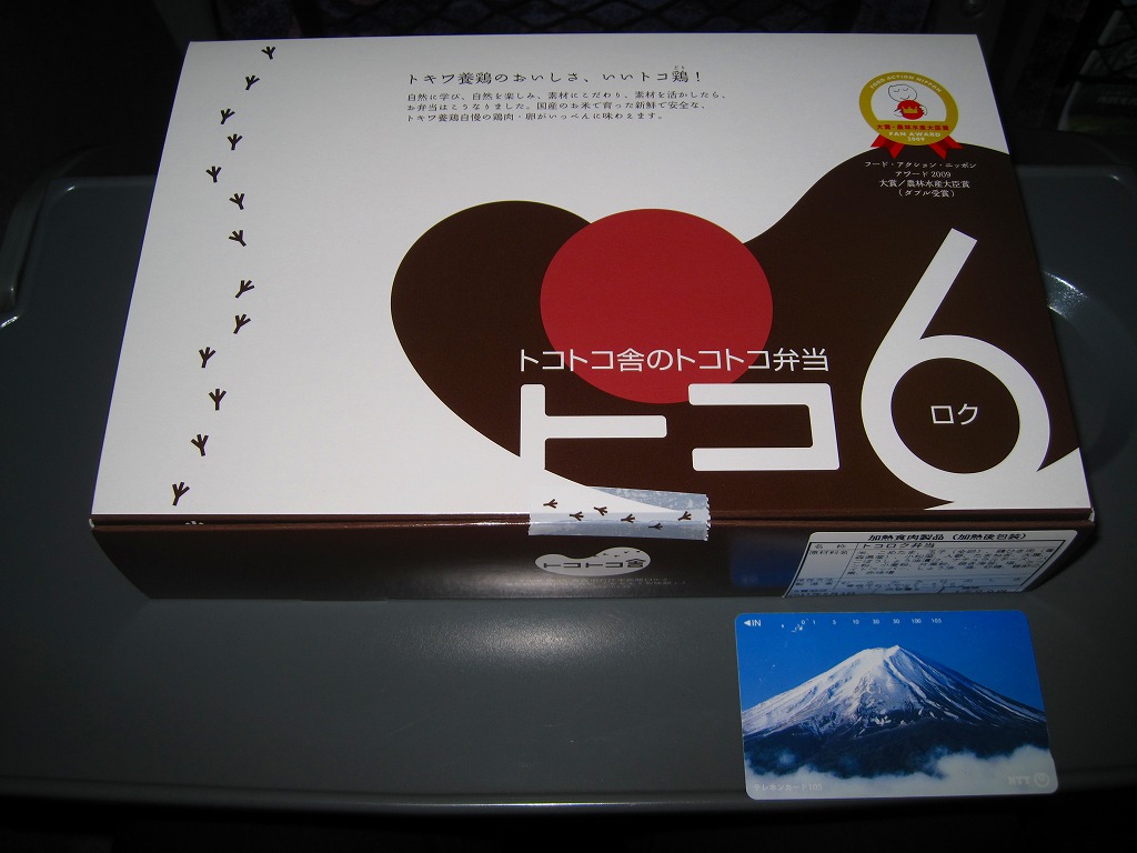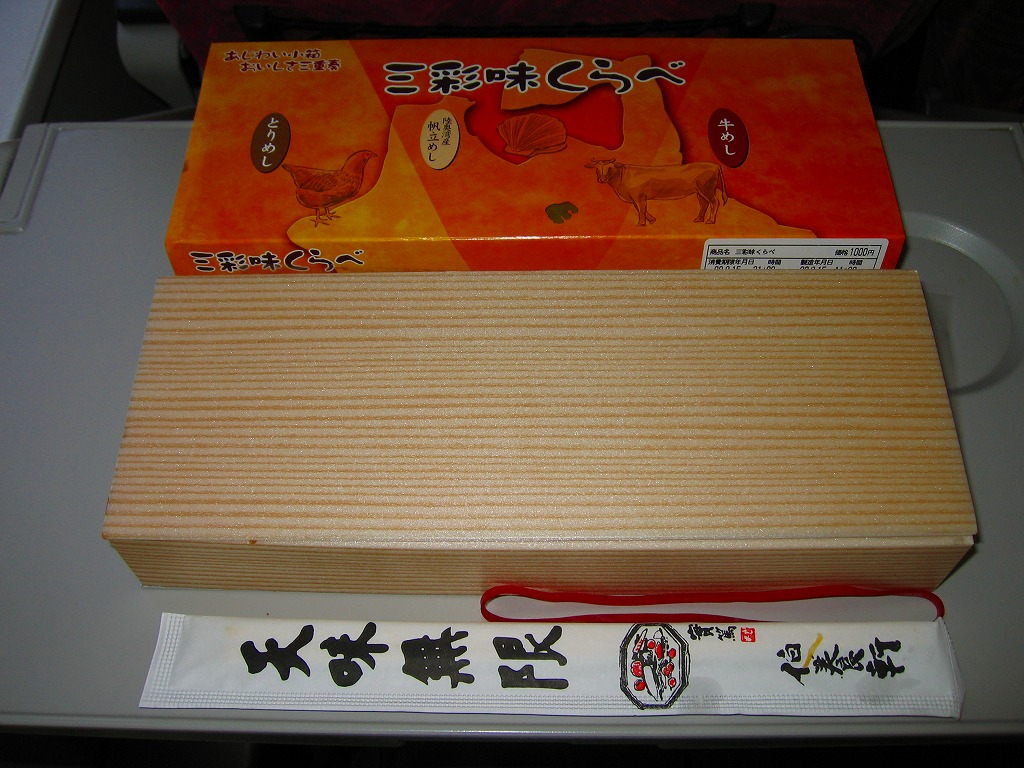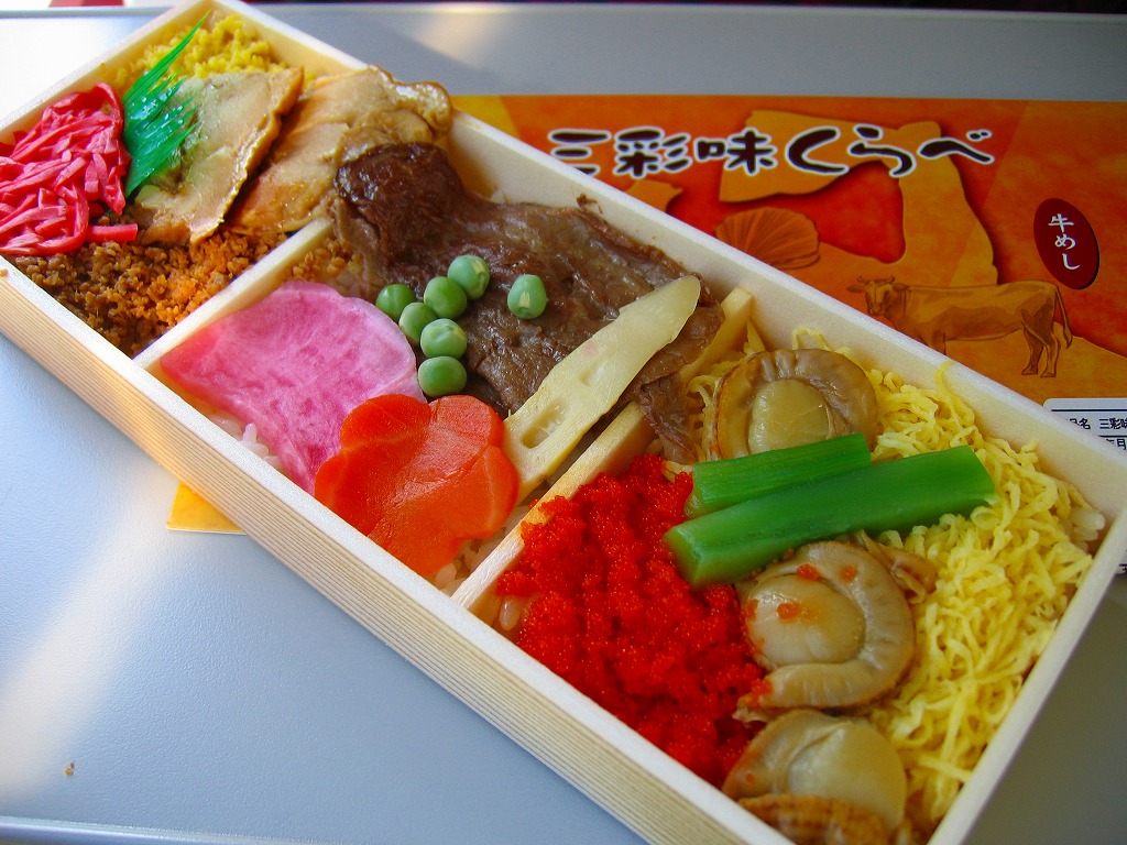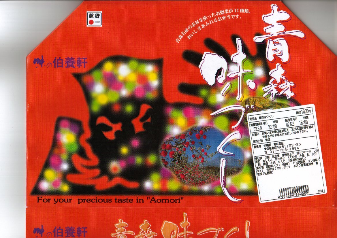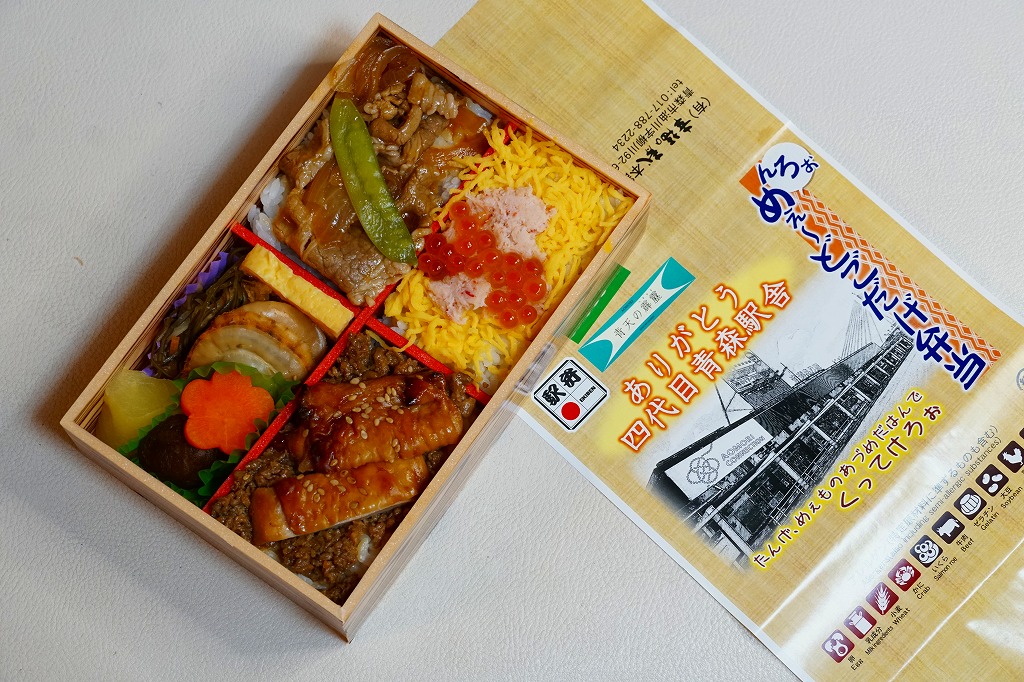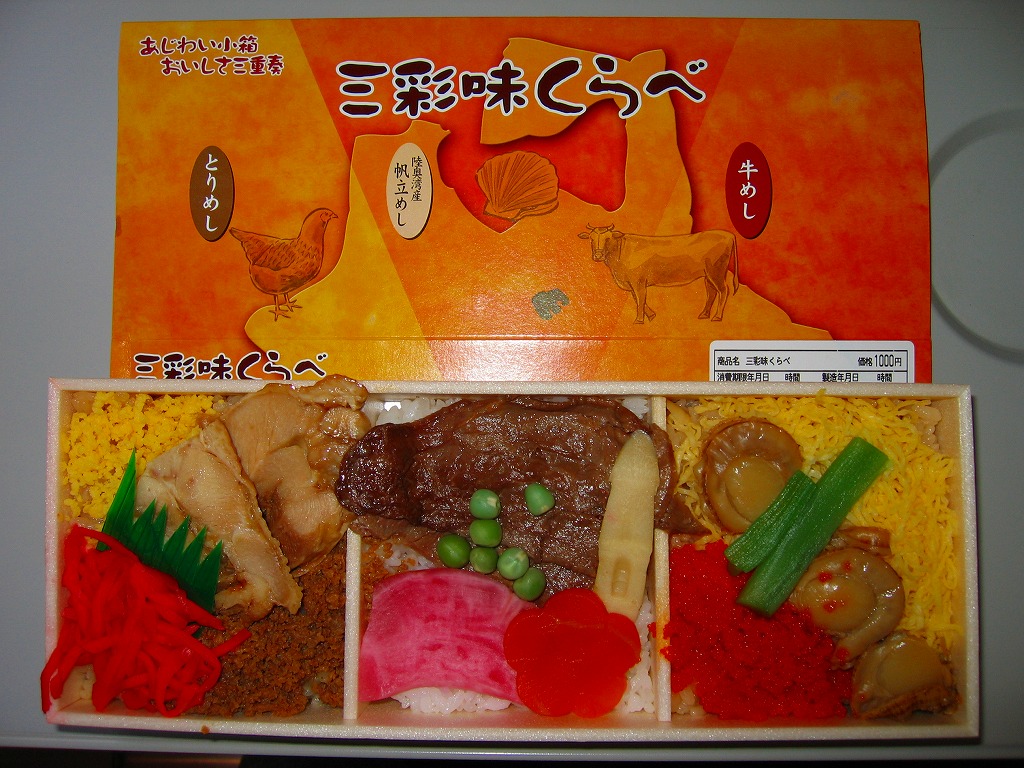 2008(平成20)年に発売か。縦8センチ・横24センチの細長い長方形の容器を、青森県とトリ・ホタテ・ウシを描いたボール紙の枠にはめる。中身はその絵のとおり、茶飯の上に鳥そぼろ、鶏照焼、玉子そぼろと紅生姜を載せたとりめし、白御飯の上に焼肉と人参とグリーンピースに赤かぶ漬を載せた牛めし、茶飯の上をベビーホタテと錦糸卵ととびっこで覆った帆立めしが1区画ずつ。青森ではそのいずれもアリなのだろう、味は可もなく不可もなし。不思議とブログ等での紹介例がほぼ皆無である。2009年頃までの販売か。