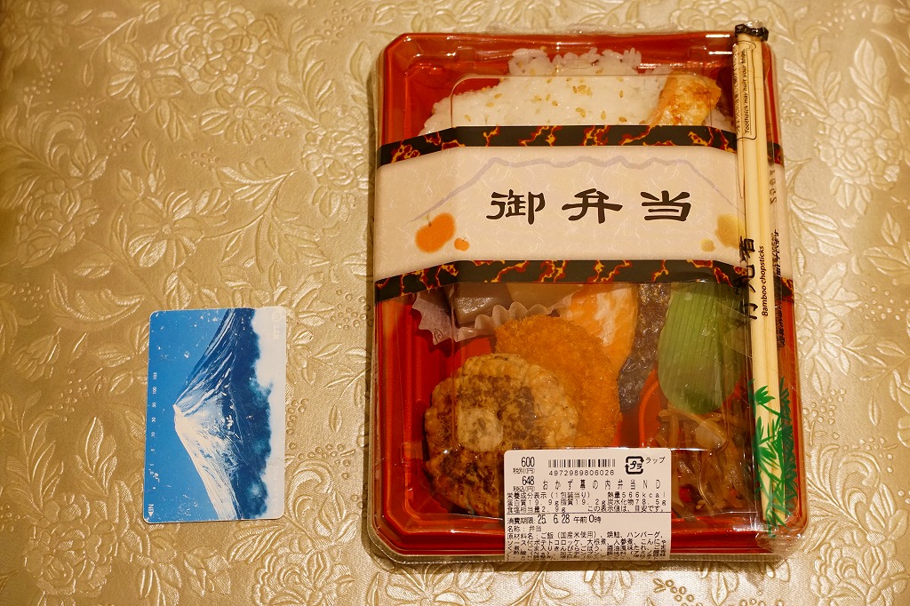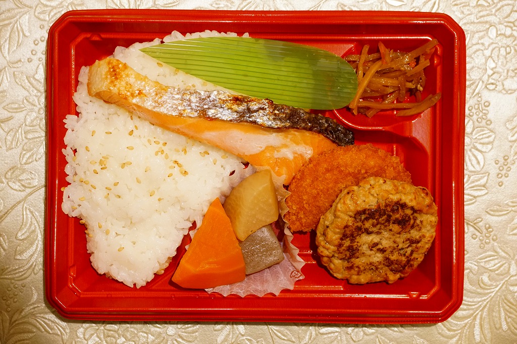 新青森駅のコンビニで購入。薄く平たいプラ容器に、白飯、焼き鮭、ハンバーグ、コロッケ、煮物、きんぴらを詰める。見た目はスーパーのお惣菜。調製元は新青森駅の駅弁屋で、駅の売店で売られる弁当であり、惣菜になくコンビニ弁当でも稀な紙帯を巻くが、さすがにこれでは駅弁にみえないか。品名は「おかず幕の内弁当ND」とあった。調製元としてはこちらがむしろ祖業であろう。