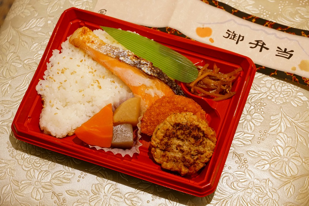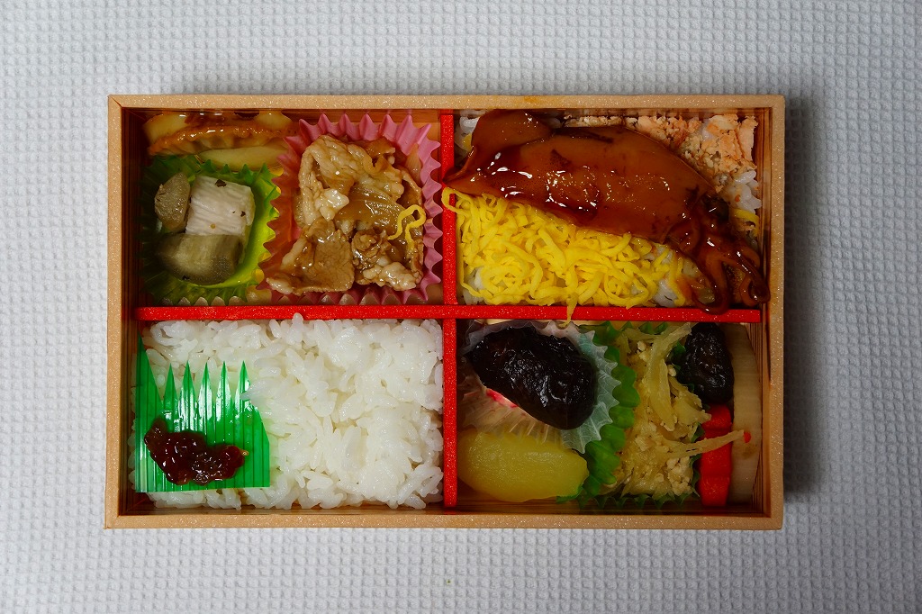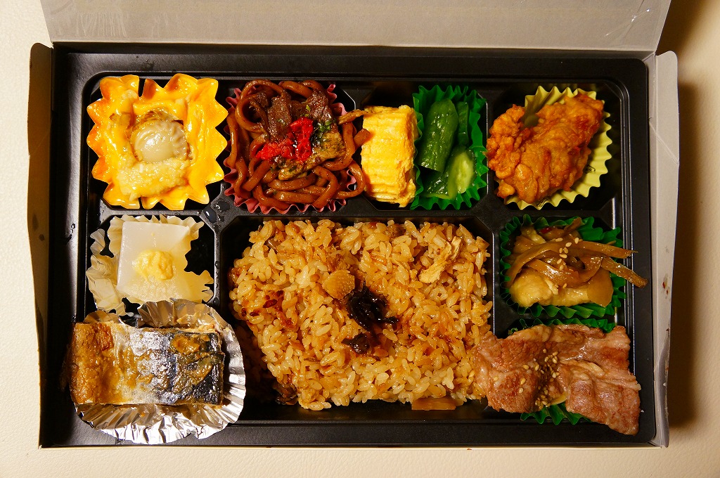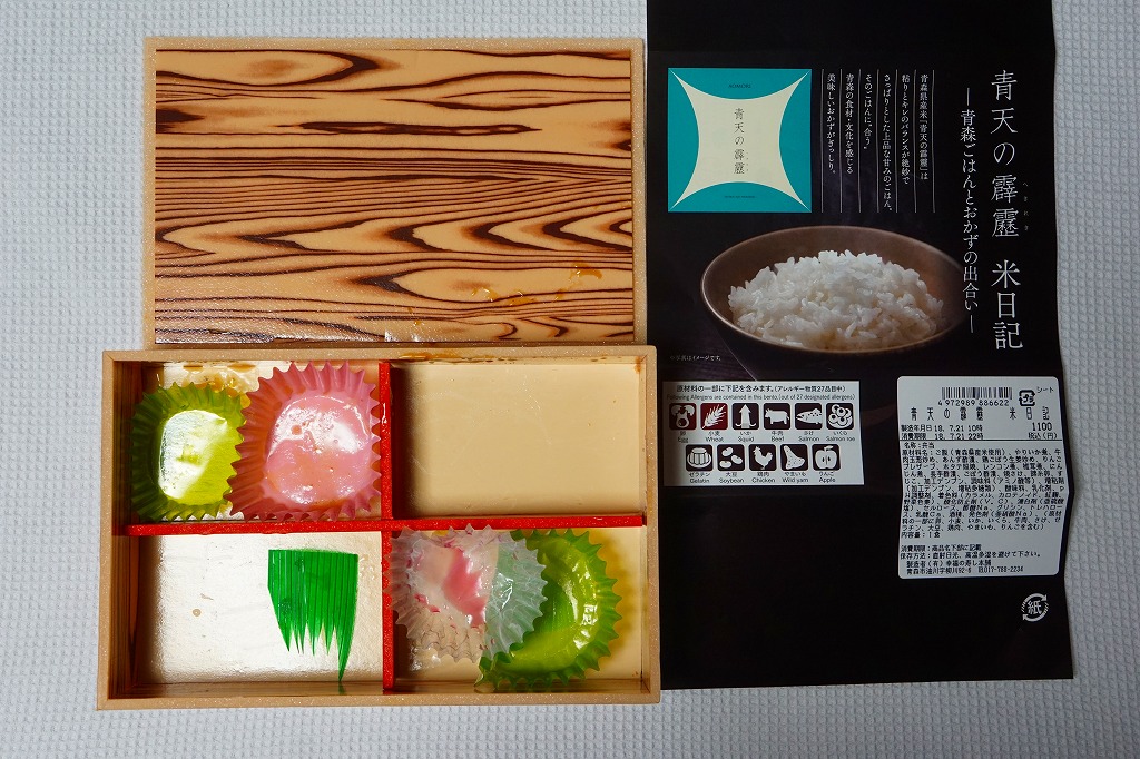 4区画の中身は、白御飯と筋子、ホタテ照焼と十和田バラ焼きと東北ピクルス、白御飯を覆うヤリイカ姿煮と錦糸卵と秋鮭のほぐし、煮物とアンズしそ巻と、ごぼうと鶏の生姜炒めとリンゴのシロップ煮。米に合うおかずを中心に、青森県産食材をふんだんに使ったという、お米とそのおいしさだけに特化しない、青森県オールスターズ。2020年の春頃までの販売か。