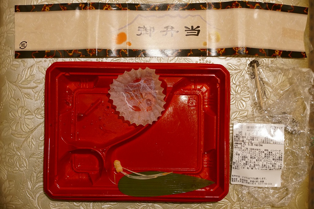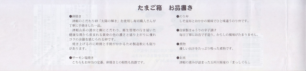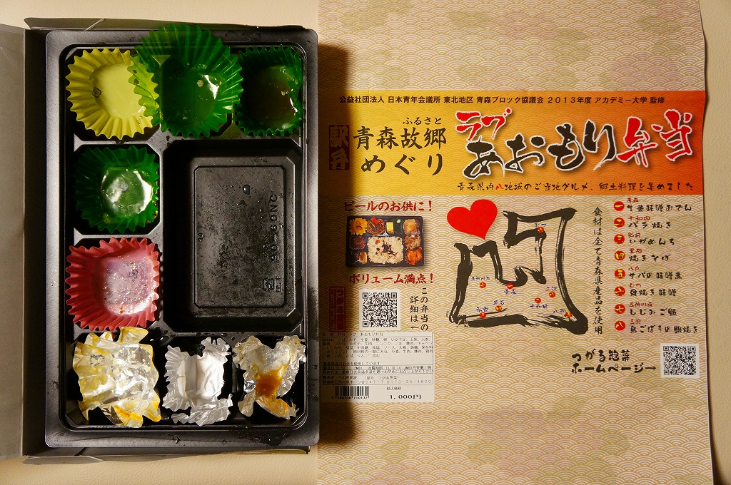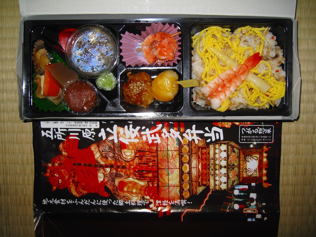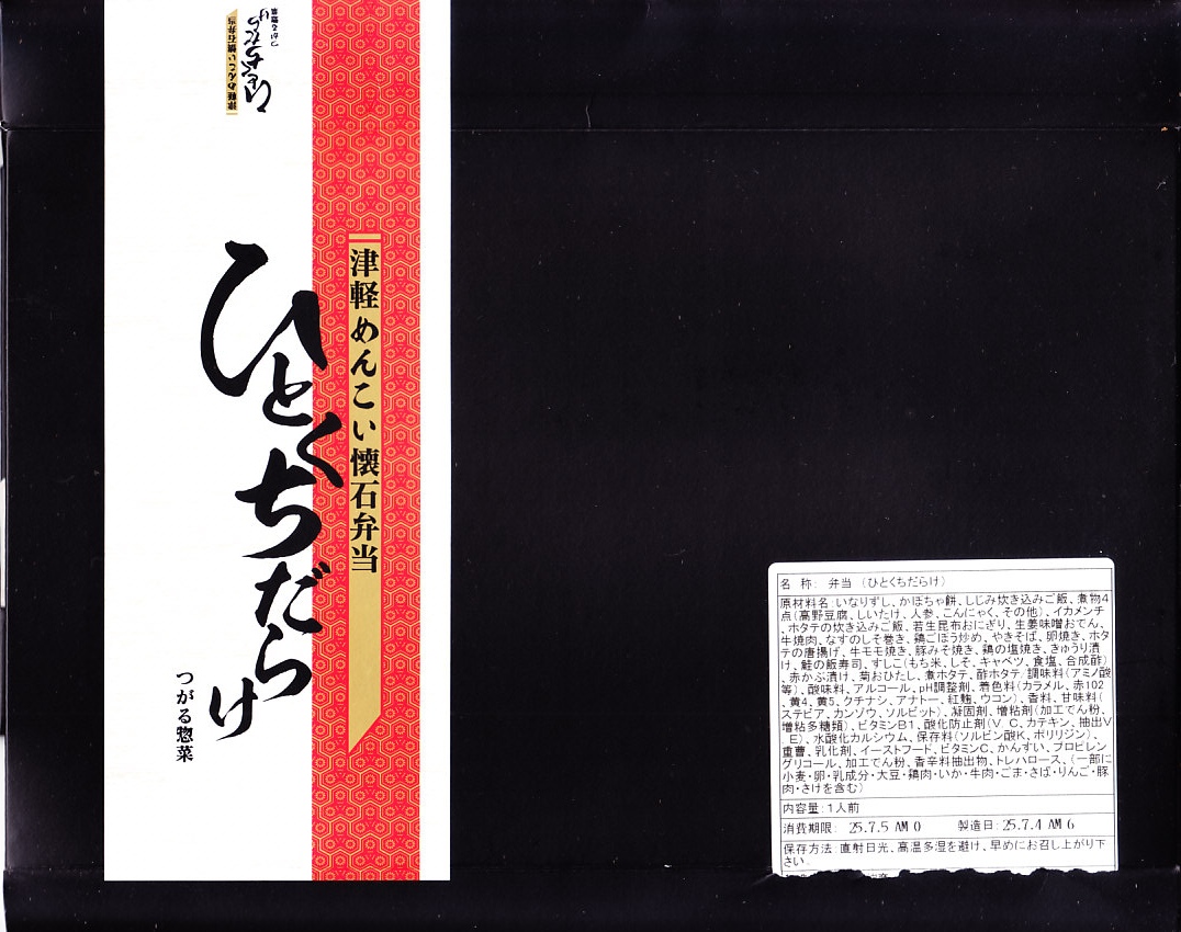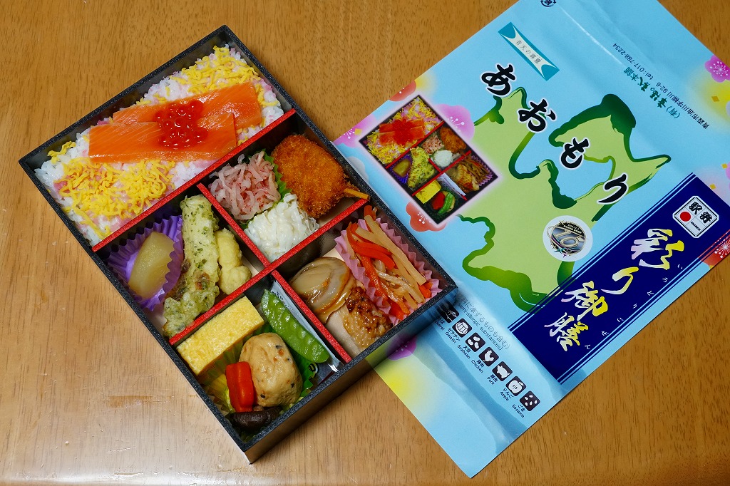 2010(平成22)年12月4日の東北新幹線新青森延伸と同日からの東京駅「新青森開業記念駅弁大会」に向けてデビューか。横あるいは縦に33センチもある、とても長い市販の仕出し弁当用ボール紙製容器を使用、五所川原の立佞武多の写真をまるまる掲載した掛紙を巻く。黒いプラ製トレーに収まる中身は、ボイルエビと姫竹が載る五目飯に、ホタテと鶏肉の串、サケの串、ホタテやニンジンやこんにゃくなどの煮物、じゅんさいゼリー、赤カブ、りんご煮など。「地元食材をふんだんに使った郷土料理」は見栄えも味も渋めなので、宣伝文か解説文が欲しいところ。