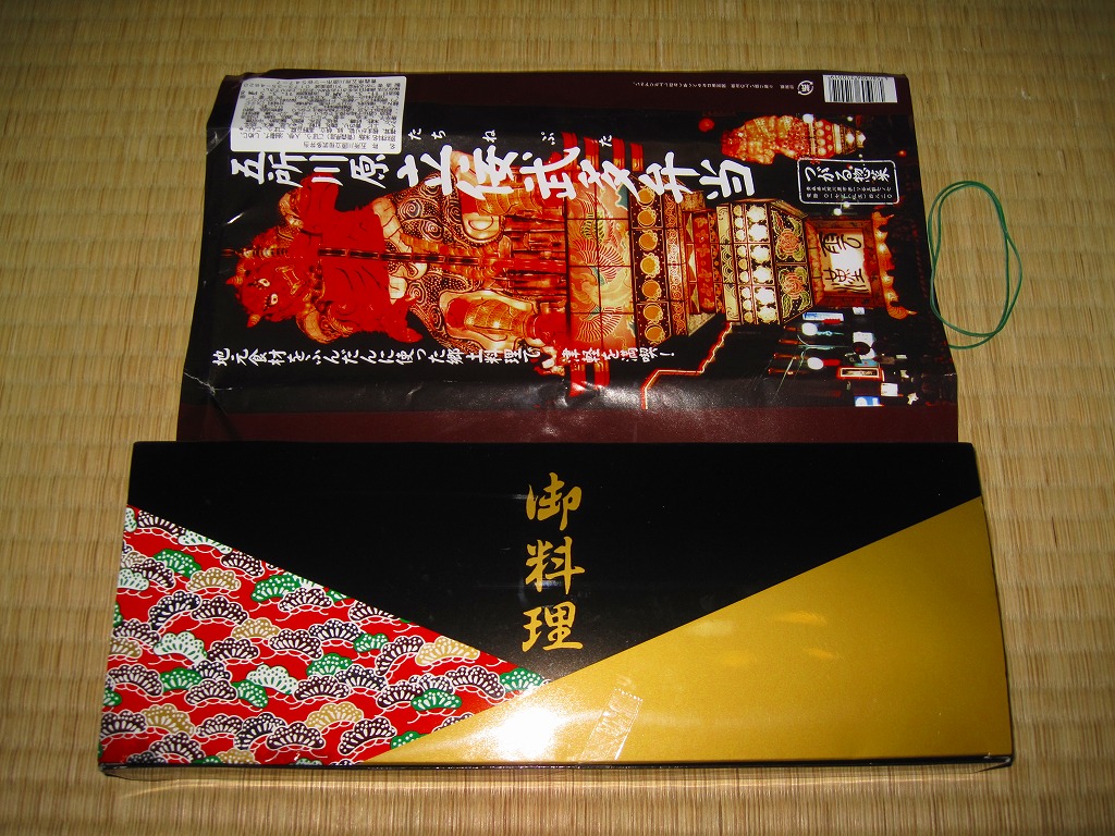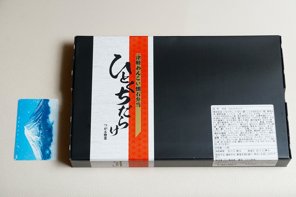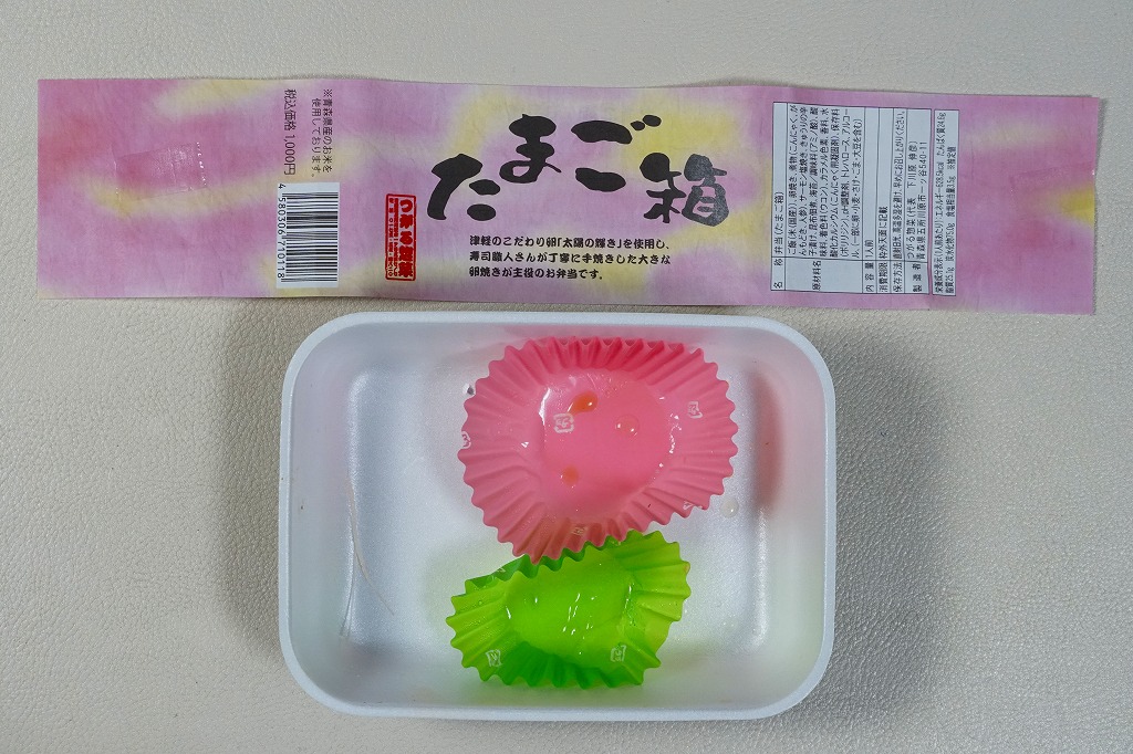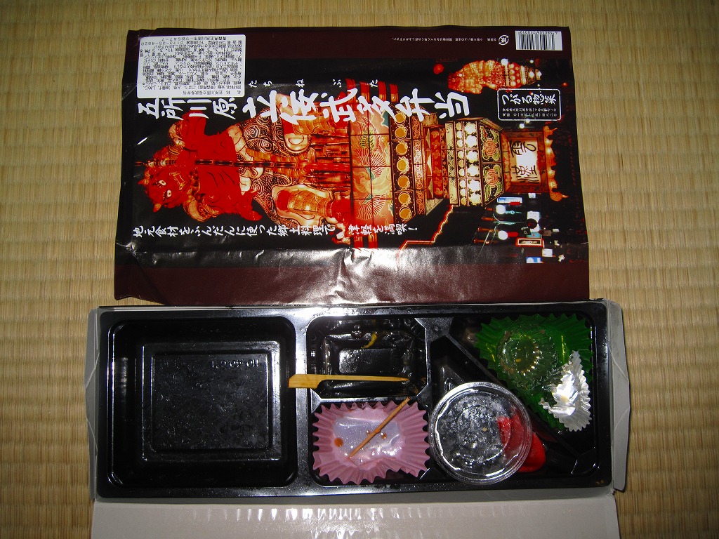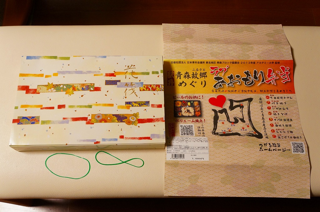 2010(平成22)年12月4日の東北新幹線新青森延伸と同日からの東京駅「新青森開業記念駅弁大会」に向けてデビューか。横あるいは縦に33センチもある、とても長い市販の仕出し弁当用ボール紙製容器を使用、五所川原の立佞武多の写真をまるまる掲載した掛紙を巻く。黒いプラ製トレーに収まる中身は、ボイルエビと姫竹が載る五目飯に、ホタテと鶏肉の串、サケの串、ホタテやニンジンやこんにゃくなどの煮物、じゅんさいゼリー、赤カブ、りんご煮など。「地元食材をふんだんに使った郷土料理」は見栄えも味も渋めなので、宣伝文か解説文が欲しいところ。