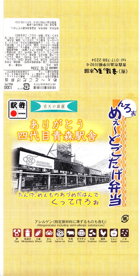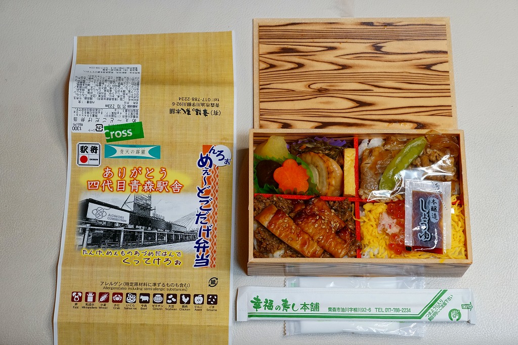 東京駅から東北新幹線はやぶさ号で3時間強。青森市は本州北部で陸奥湾に面した、人口約26万人の港町。明治時代に入り県庁が置かれ、帝都からの鉄道が開通して北海道への航路が拓かれたことで、県内一の都市として発展した。駅弁は新幹線の改札内や高架下のコンビニで売られるが、完売していることが多いと思う。1986(昭和61)年11月1日開業、青森県青森市大字石江字高間。
