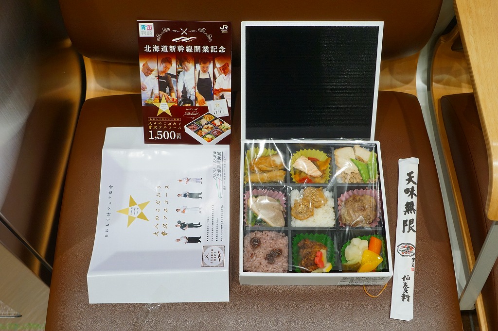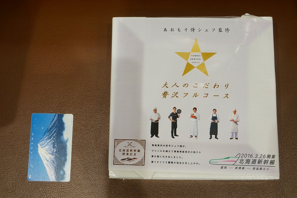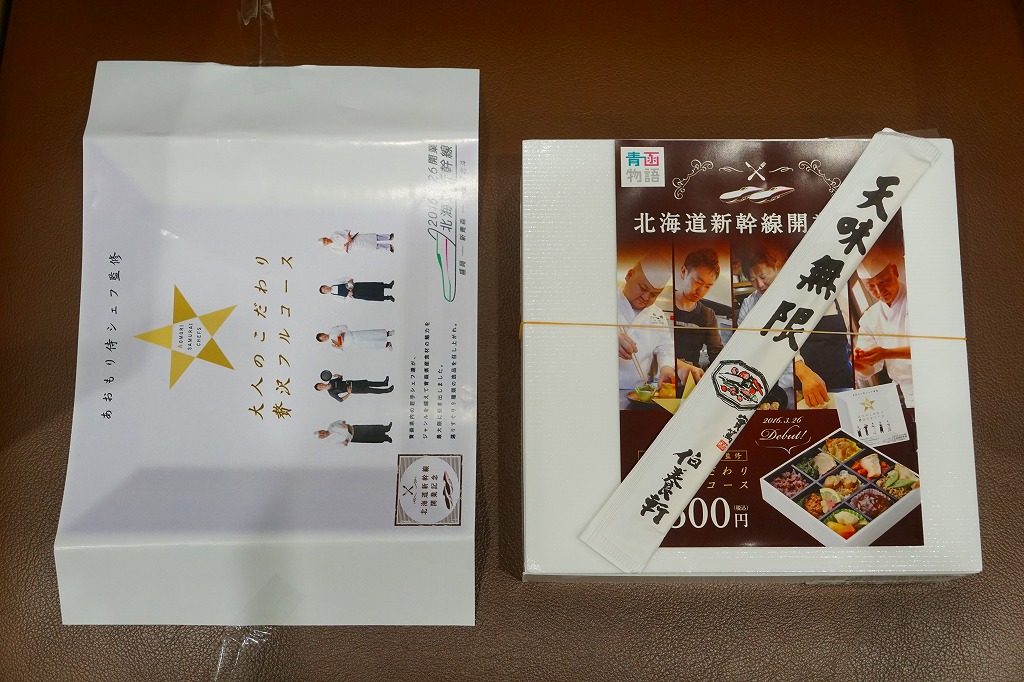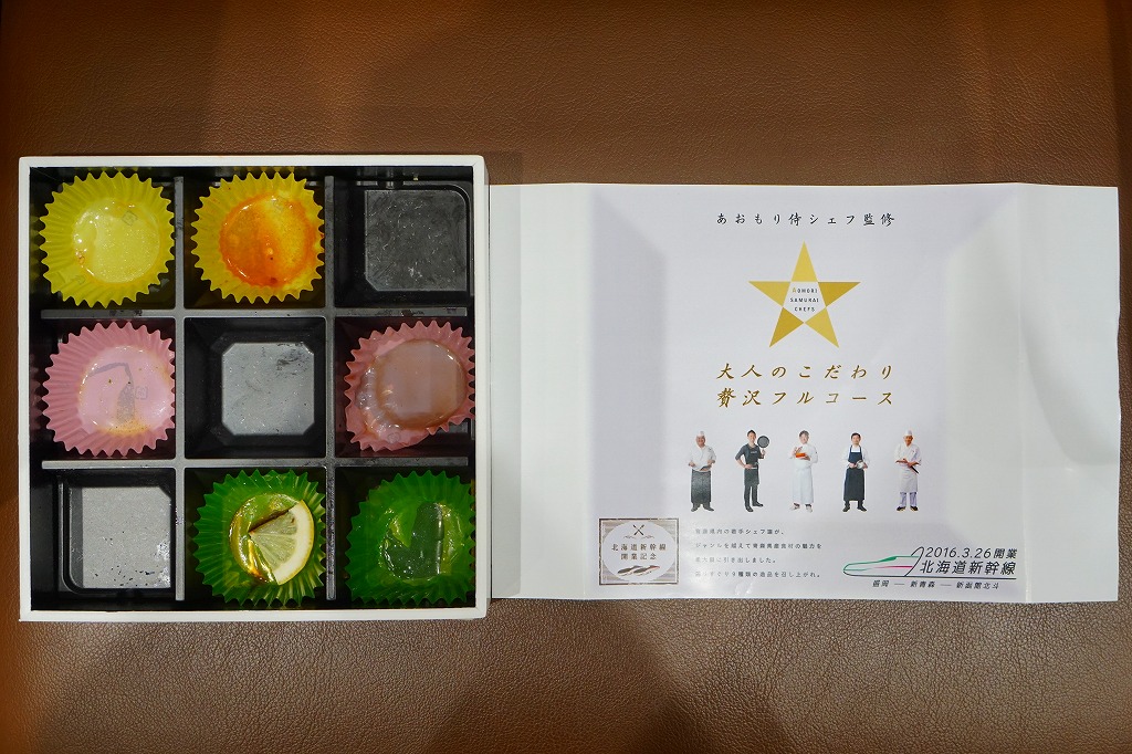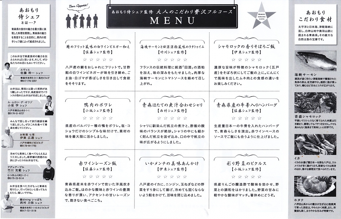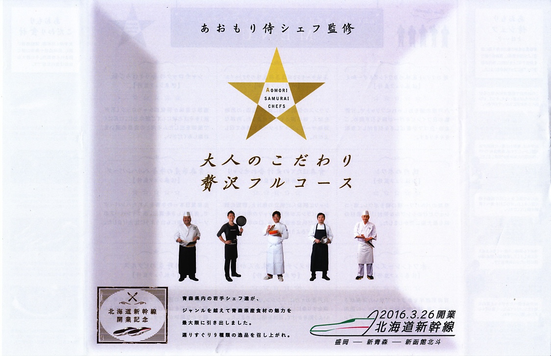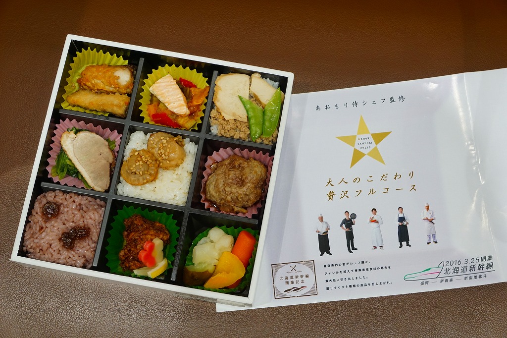 2016(平成28)年3月26日の北海道新幹線開業に合わせて、同日に新青森・青森・盛岡の各駅で発売。駅弁の名前と、大きく白い掛紙のデザインや容器に高級感、または高級料理の感じを受ける。「あおもり侍シェフ」なる青森県内の若手シェフ5人が監修したという中身について、掛紙の裏面で監修者名とともに、しっかり解説される。