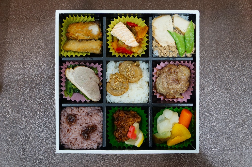 9区画の中身は左上から右に向けて、「鯖のフリット風味の白ワインビネガー和え【佐藤シェフ監修】」「海峡サーモンと田酒酒粕風味のラタトゥイユ【竹川シェフ監修】」「シャモロックの香りそぼろご飯【伊東シェフ監修】」「鴨肉のボワレ【小坂シェフ監修】」「青森ほたての煮汁合わせシャリ【西村シェフ監修】」「青森県産の牛蒡入りハンバーグ【佐藤シェフ監修】」「赤ワインレーズン飯【佐藤シェフ監修】」「いかメンチの美味あんかけ【伊東シェフ監修】」「彩り野菜のピクルス【小坂シェフ監修】」とある。