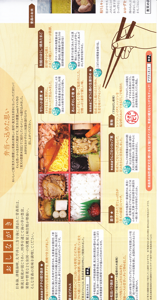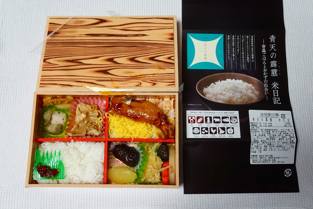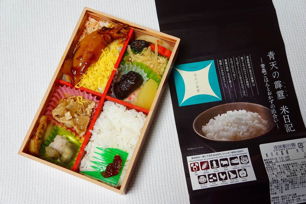 2018(平成30)年7月1日に新青森駅、青森駅、八戸駅で発売。調製元とJR東日本盛岡支社が共同開発した、青森県のブランド米「青天の霹靂(せいてんのへきれき)」がテーマの駅弁。掛紙の表面ではその米の魅力を、裏面では駅弁の中身を紹介する。