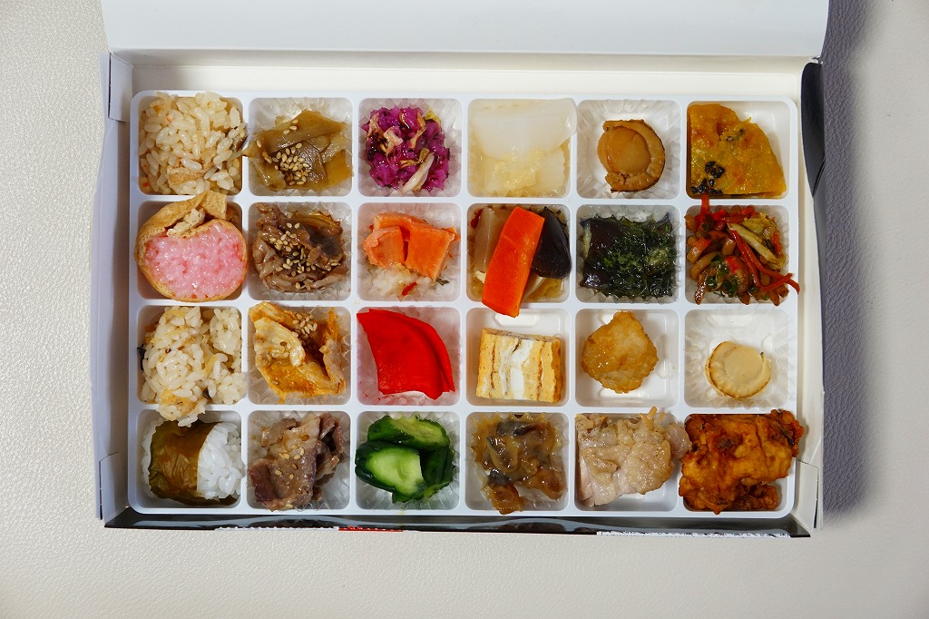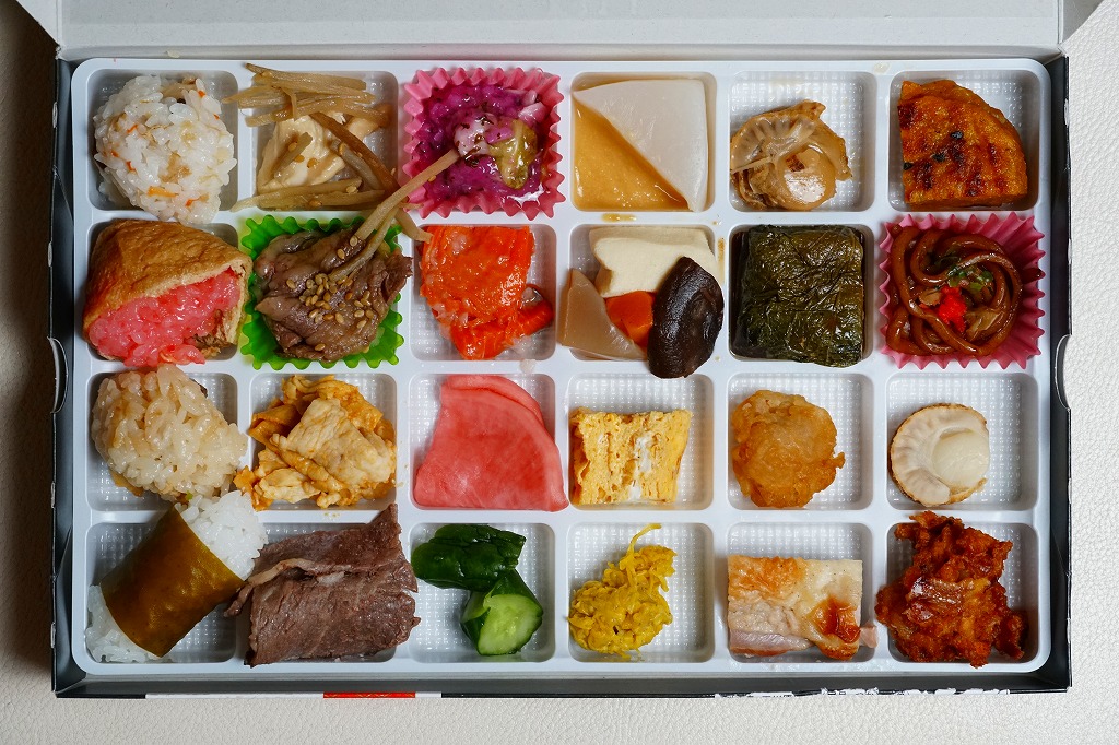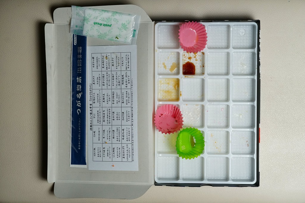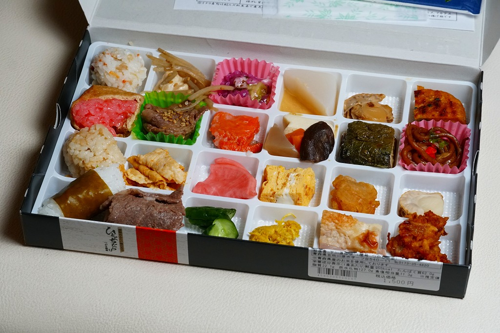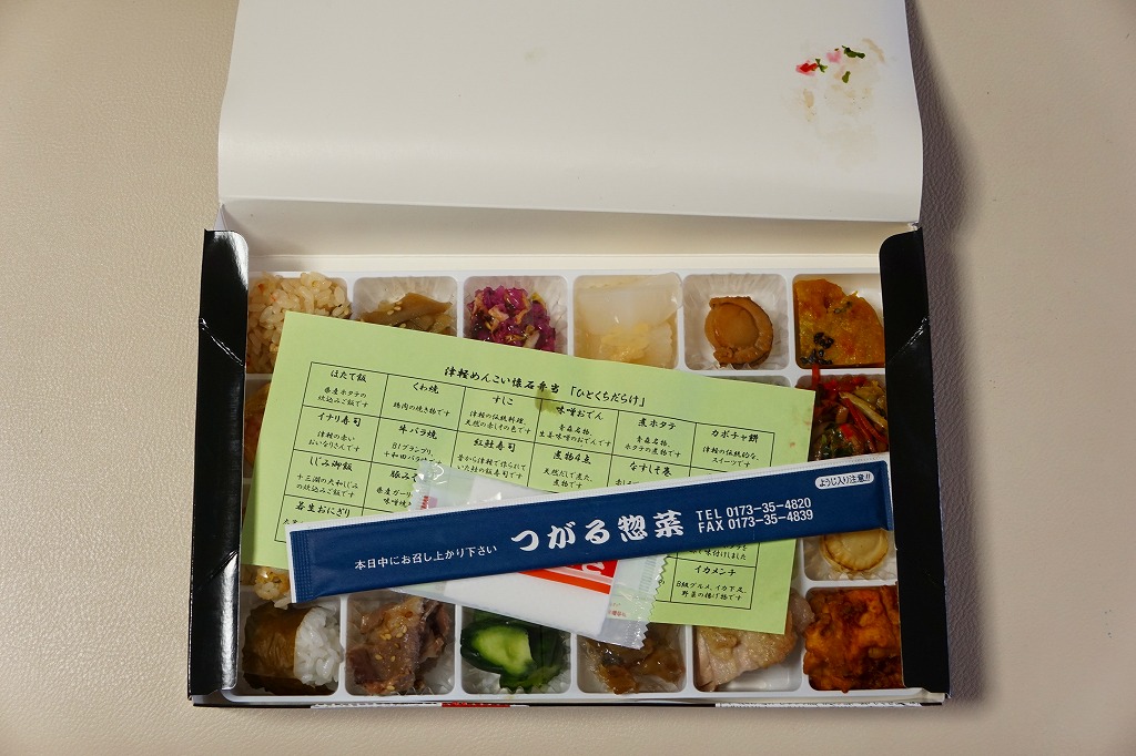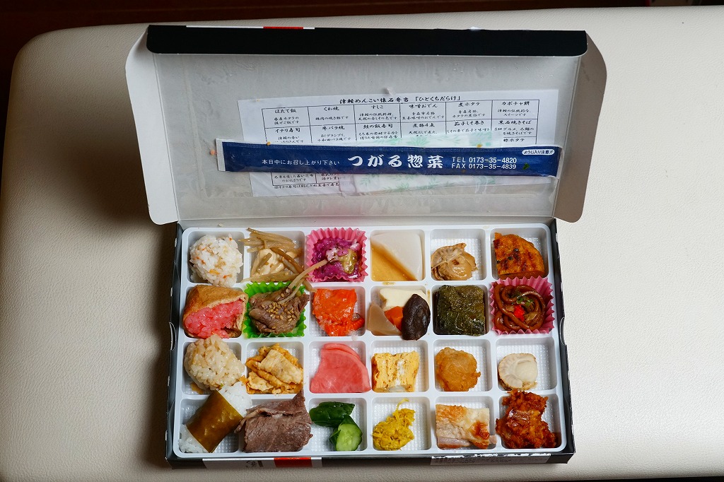 2016(平成28)年2月1日に東京駅と大宮駅で発売か。中身は写真のとおり、ほたて飯、イナリ寿司、しじみ御飯、若生(わかおい:1年ものの昆布)おにぎり、くわ焼、牛バラ焼、豚みそ漬、牛源タレ焼、すしこ、鮭の飯寿司、赤カブ漬、きゅうり漬、味噌おでん、煮物4点、手作り卵焼き、菊のおひたし、煮ホタテ、茄子しそ巻き、ホタテ唐揚げ、鶏肉塩焼、カボチャ餅、黒石焼きそば、酢ホタテ、イカメンチと、実に24種類ものメニューが、高級チョコ大の区画に収まる。アイデアとしてありきたりでも、商品化と東京への輸送は驚くべき。食べて疲れを覚えそうなレベルの、究極のおつまみ駅弁かもしれない。価格は2016年の発売時や購入時で1,200円、2017年9月から1,350円、2025年時点で1,500円。