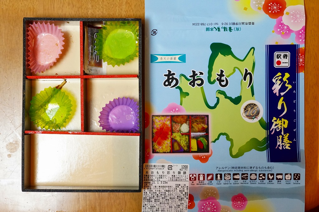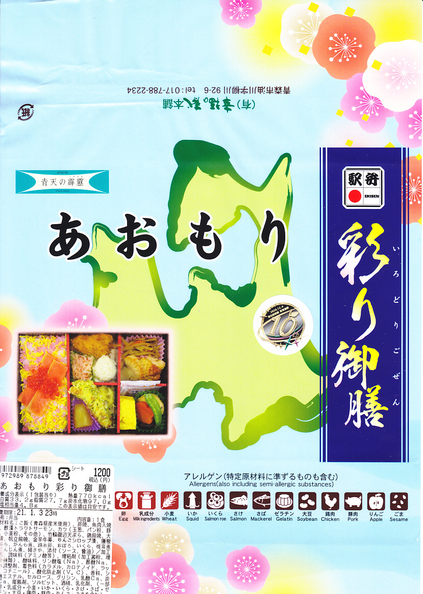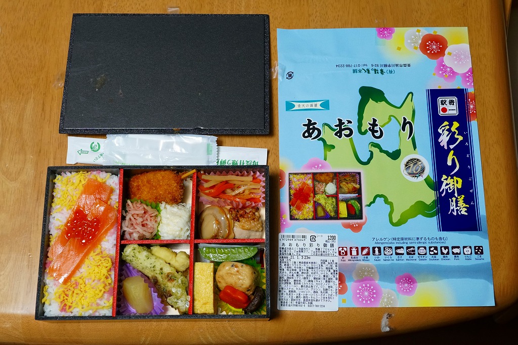 東北新幹線の新青森駅開業10周年を記念し、2020(令和2)年12月12日から1,200円で、新青森、青森、八戸、盛岡の各駅で6,000個を販売。12にこだわったように見えるが理由は不明で、そもそも新幹線の開業は12月4日だった。中身は掛紙の写真のとおり、御飯に青森海鮮ちらし寿司と同じサーモン棒2本を載せ、ホタテ照焼と鶏照焼、きんぴらごぼう、煮物、玉子焼、イカ焼売とカニ焼売とトンカツ、ちくわ磯辺揚、リンゴのシロップ漬など、おかずがたっぷり。紹介記事では2021年4月以降も売られたとするが、収穫報告は3月までのものしか出てこない。