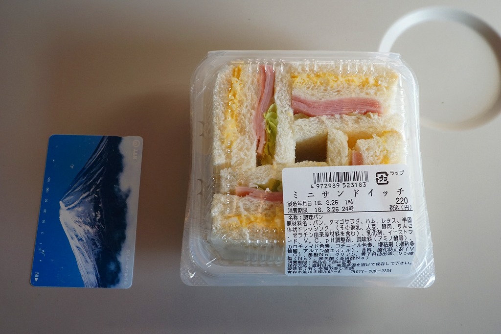 早朝の下りと深夜の上りに各2本のみが設定された北海道新幹線はやて号では、開業日に限り車内販売が実施され、通常は売り子さんが乗務しない。このサンドイッチが以後にどこかで買えるかどうかは分からない。