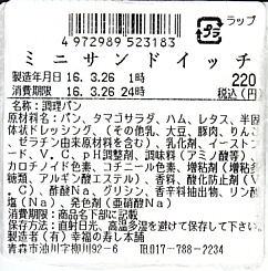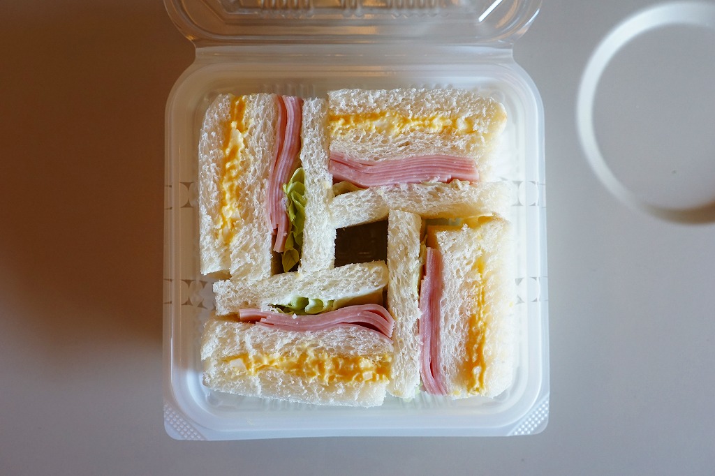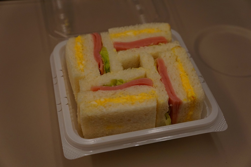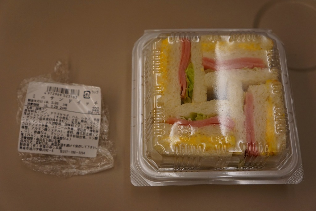 北海道新幹線の一番列車の車内で買えたサンドイッチ。食パン四等分サイズの、正方形のタマゴサンドとハムレタスサンドが、四方を向いてプラ製のサンドイッチ向け容器に収まる。国内の列車の車内販売で買えたサンドイッチとしては、経験上日本一の安さ。調製元は新幹線新青森駅の開業の頃からの駅弁屋。