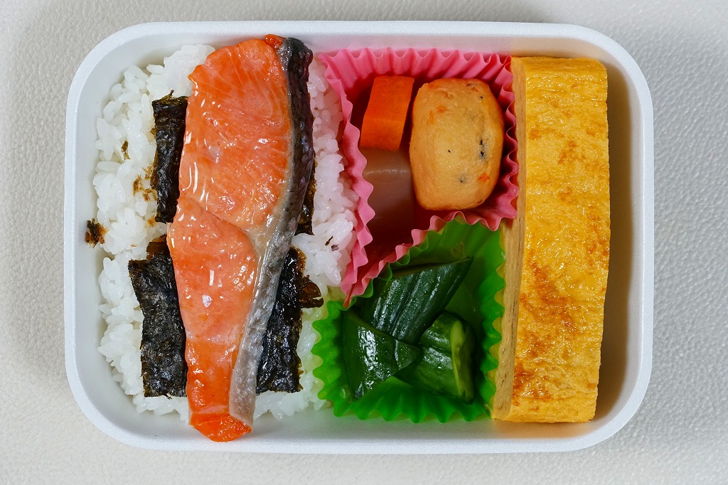2025(令和7)年10月1日に新青森駅などで発売、同日からのJR東日本の駅弁キャンペーン「駅弁味の陣2025」にエントリー。同キャンペーンでは復刻でなく新作の駅弁と紹介したが、過去に2012年から2019年まで売られたことがあるはず。当時の掛紙と同じような絵柄の、商品名の紙帯を巻いたホカ弁向け発泡材容器の半分に、白飯を詰め、昆布佃煮と海苔を貼り、サーモンの塩焼きを置く。残り半分に、津軽のこだわり卵「太陽の輝き」を使ったという大きな卵焼き、にんじんとこんにゃくとがんもどきの煮物、自家製きゅうりの辛子漬けを詰める。この大胆で整然とした海苔弁当は、駅弁味の陣2025で対象63駅弁中3番手タイの「味覚賞」を獲得した。