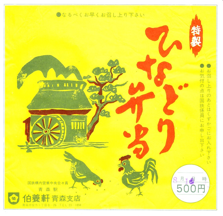1976(昭和51)年5月8日16時の調製と思われる、昔の青森駅弁の掛紙。絵柄は青森に限らないと思う、昔の農村とニワトリの風景。ひなどり弁当は1970年代から1980年代まで弘前駅や青森駅で売られた駅弁で、茶飯に錦糸卵や鶏照焼を並べて少々のおかずを添付した鶏飯だった。