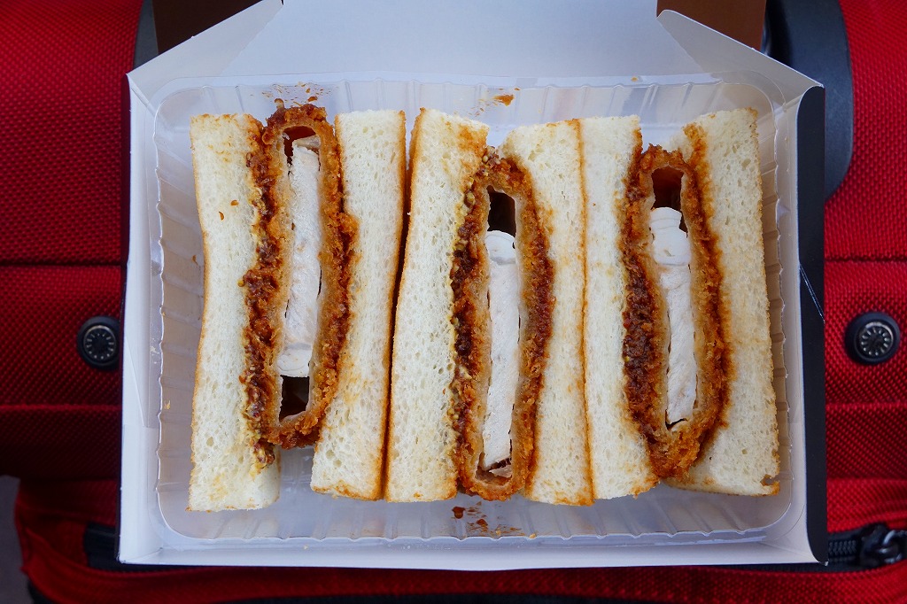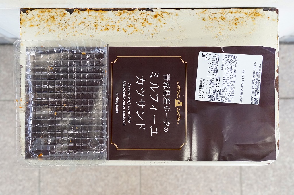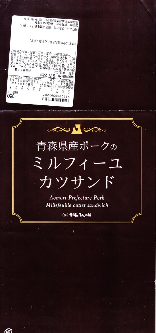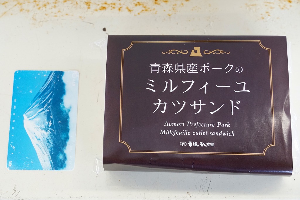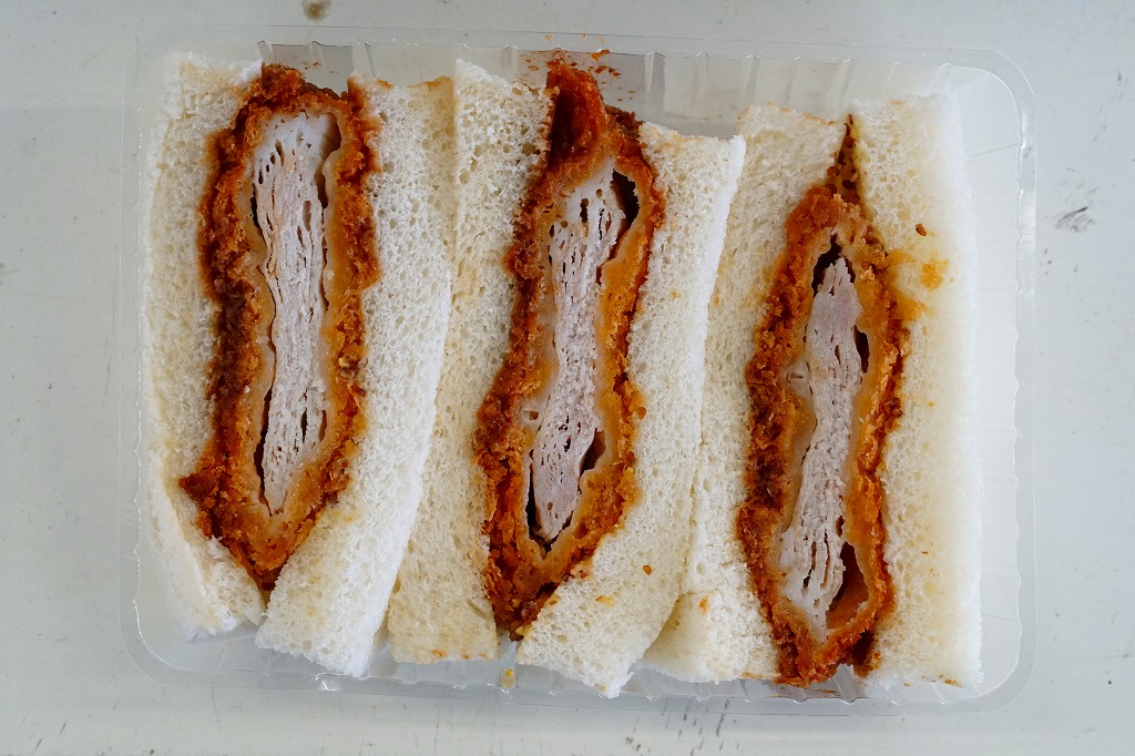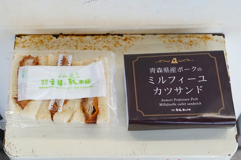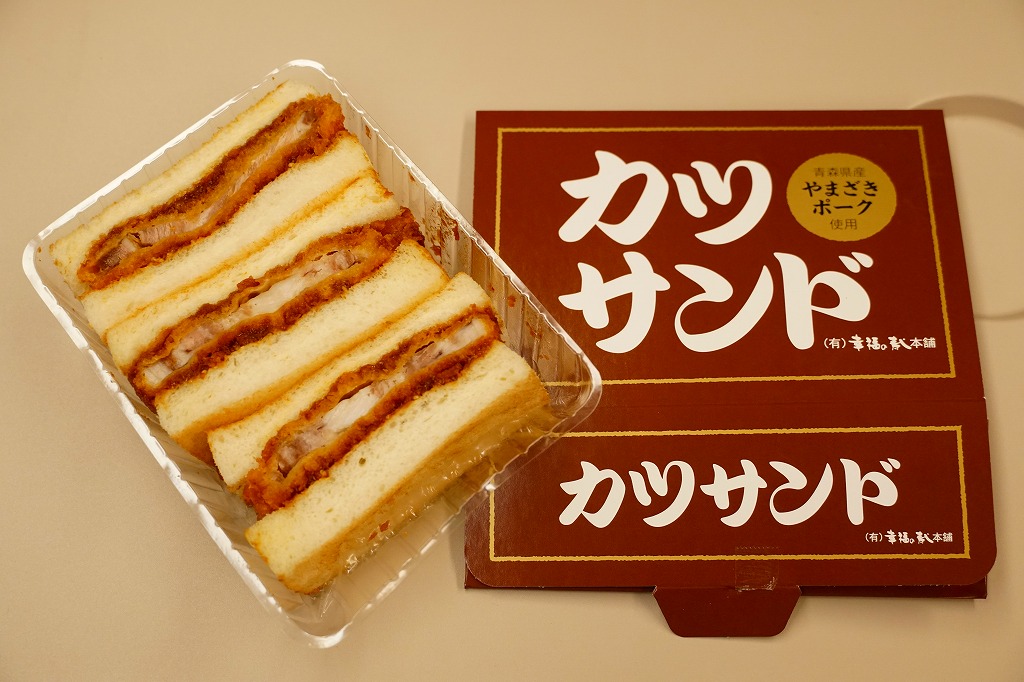 商品名は「やまざきポークカツサンド」とも。茶色い紙箱に直接、衣が厚くしっかりした、青森県産やまざきポーク使用というソース漬けのロースカツを、軽くトーストした厚めの食パンに挟んだサンドイッチを、3切れ詰める。歯応えしっかり、クセはなく、都会的においしくいただけた。2025年3月24日で終売し、翌日に「青森県産ポークのミルフィーユカツサンド」を発売。