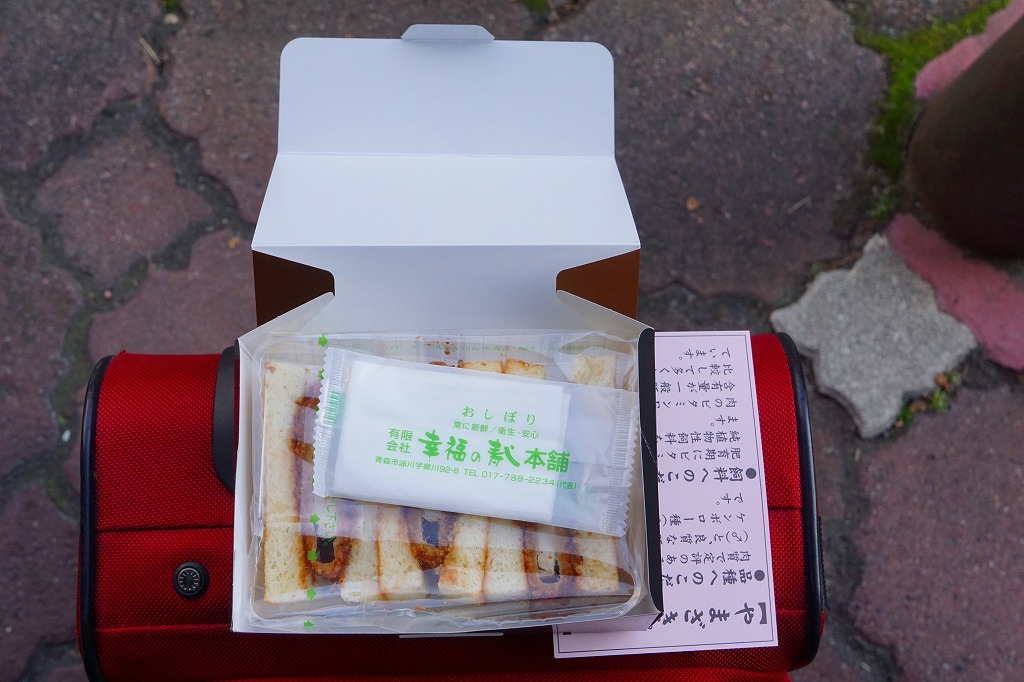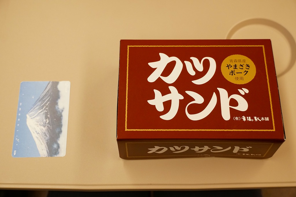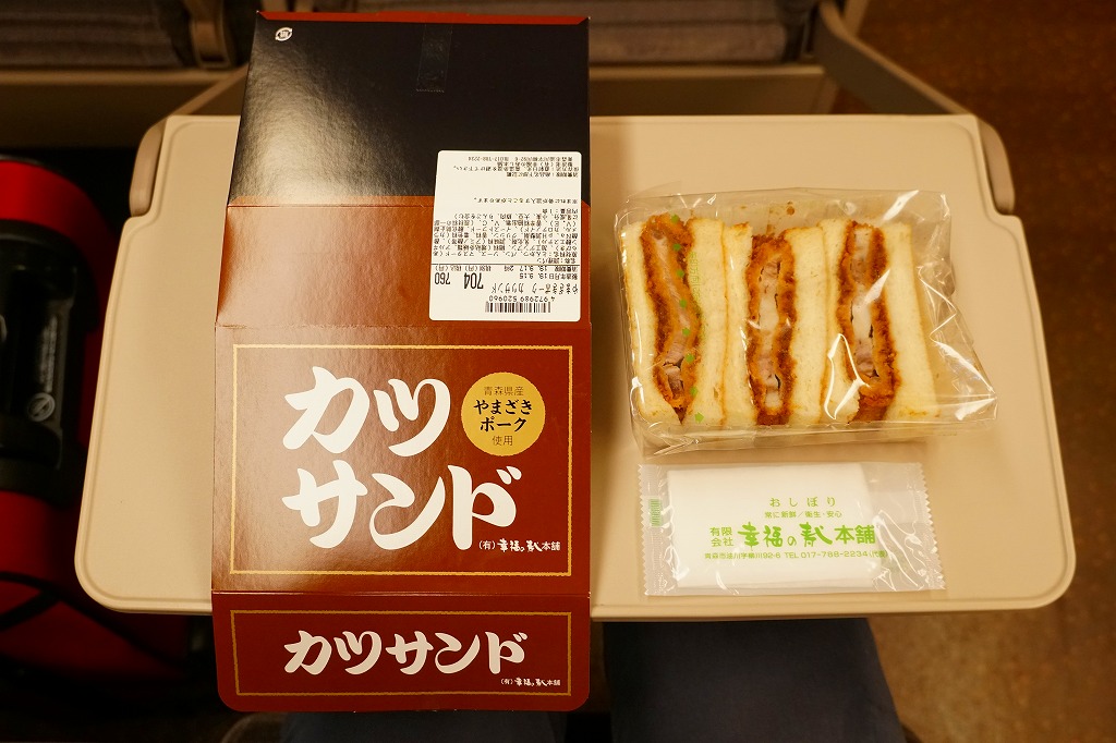 2025(令和7)年3月25日に新青森駅などで発売。下記の商品「カツサンド」をリニューアル。薄いプラ製トレーに、青森県産ポークの薄切りを重ねて揚げたトンカツのソース付けを耳なし食パンに挟んだカツサンドを3切れ詰め、袋詰めして掛紙を巻いた。包装が簡易になっても、掛紙に巻かれるので駅弁のようにみえる。味は変わらなくても、お肉の形が違うのでより柔らかい感じ。価格は190円もアップ。