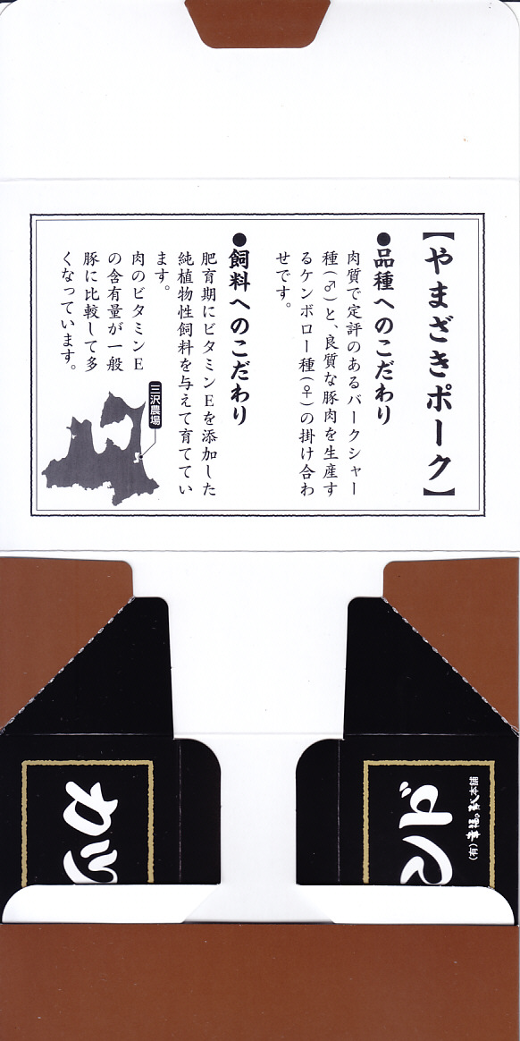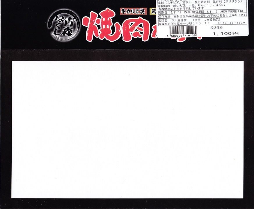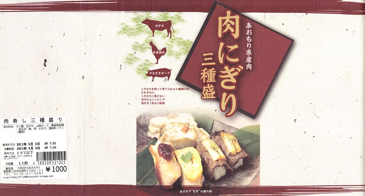 2011(平成23)年5月3日に購入した、新青森駅弁の掛紙。上記の2018年のものと、値段を除き同じ。当時は掛紙で「肉にぎり三種盛」、食品表示ラベルで「肉寿し三種盛り」と、駅弁の名前が一致していなかった。