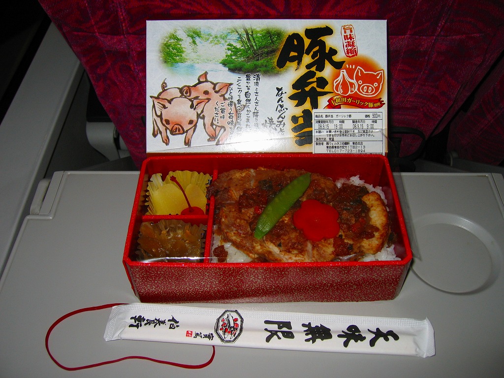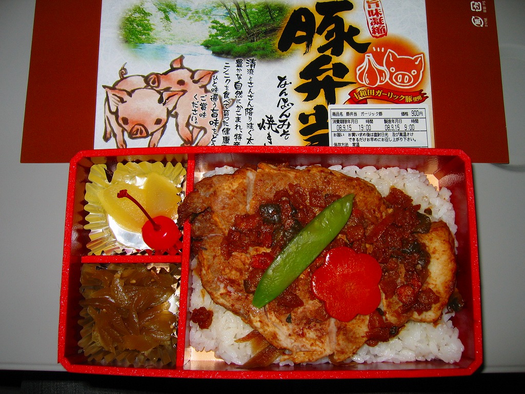 2007(平成19)年の夏までに発売か。深めの赤い容器にかかるボール紙のフタには、商品名と豚と奥入瀬かどこかの清流が印刷される。中身は白御飯の上に十和田ガーリック豚を使用したという大きな豚肉南蛮味噌焼が1枚載り、ニンジンときぬさやで彩り、きんぴらとリンゴ甘煮とさくらんぼを添えるもの。