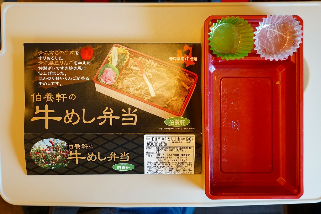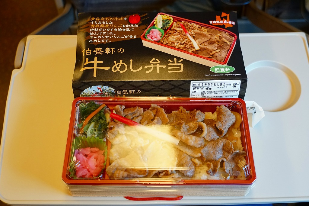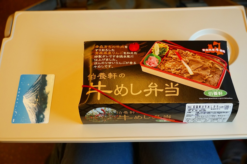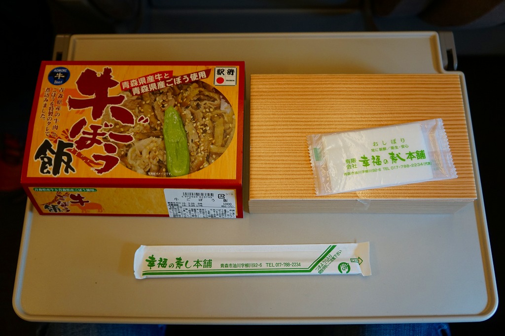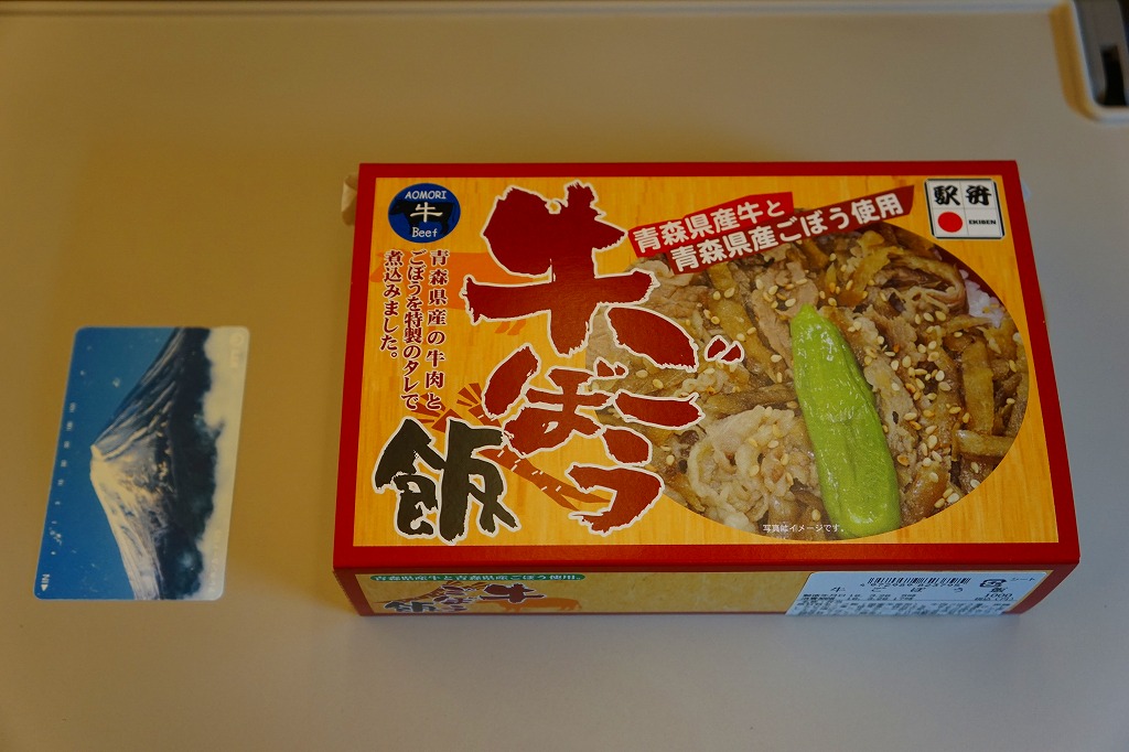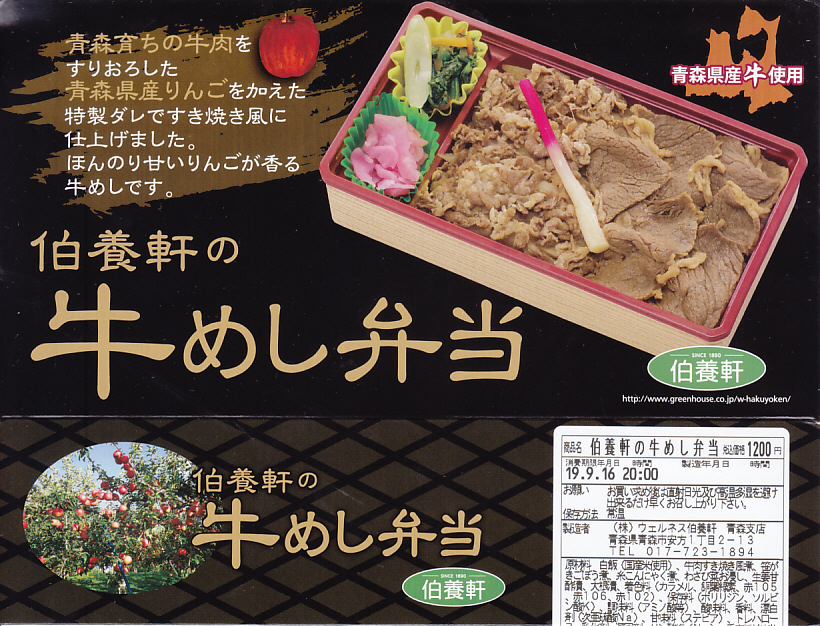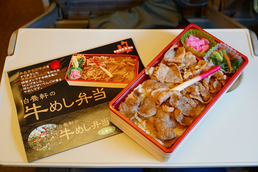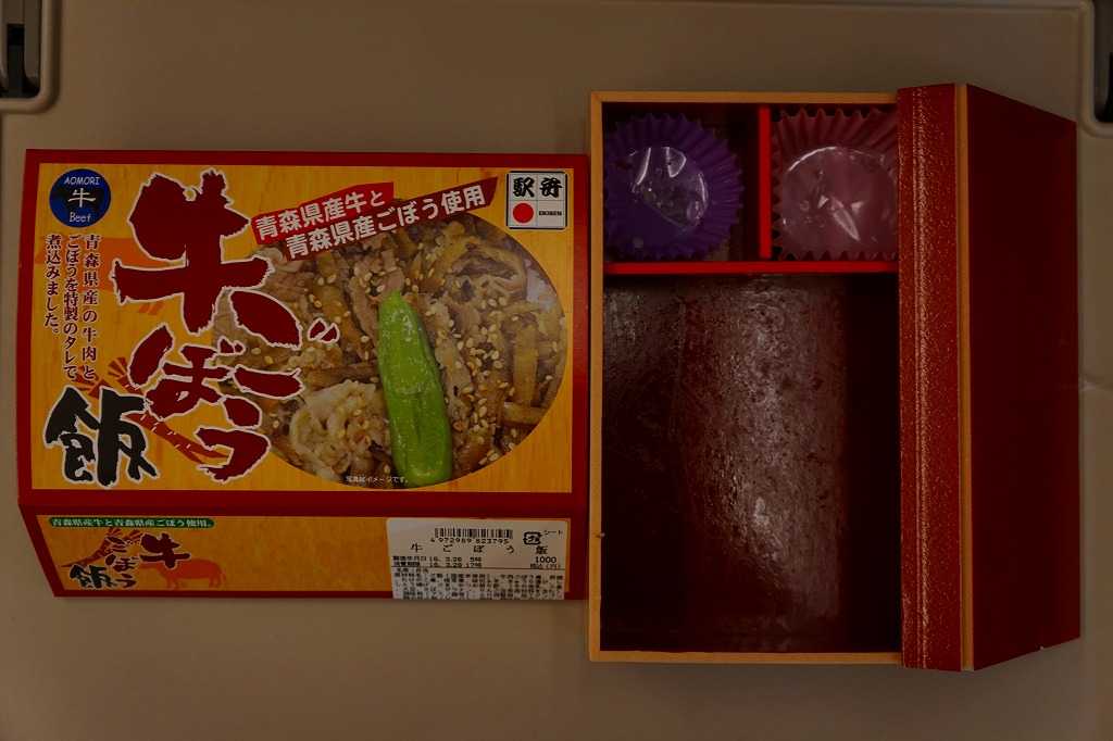 この名と姿では2017(平成29)年の発売か。2018年のJR東日本「駅弁味の陣2018」にエントリー。中身はスリーブの写真のとおり、白飯を牛肉で覆い、わさび菜と大根漬を添える、ありふれた構成の牛肉駅弁。たしかに柔らかくはある牛肉煮がやや厚めで、B級グルメの味わい。調製元の青森からの撤退により、2019年9月限りで終売となった。