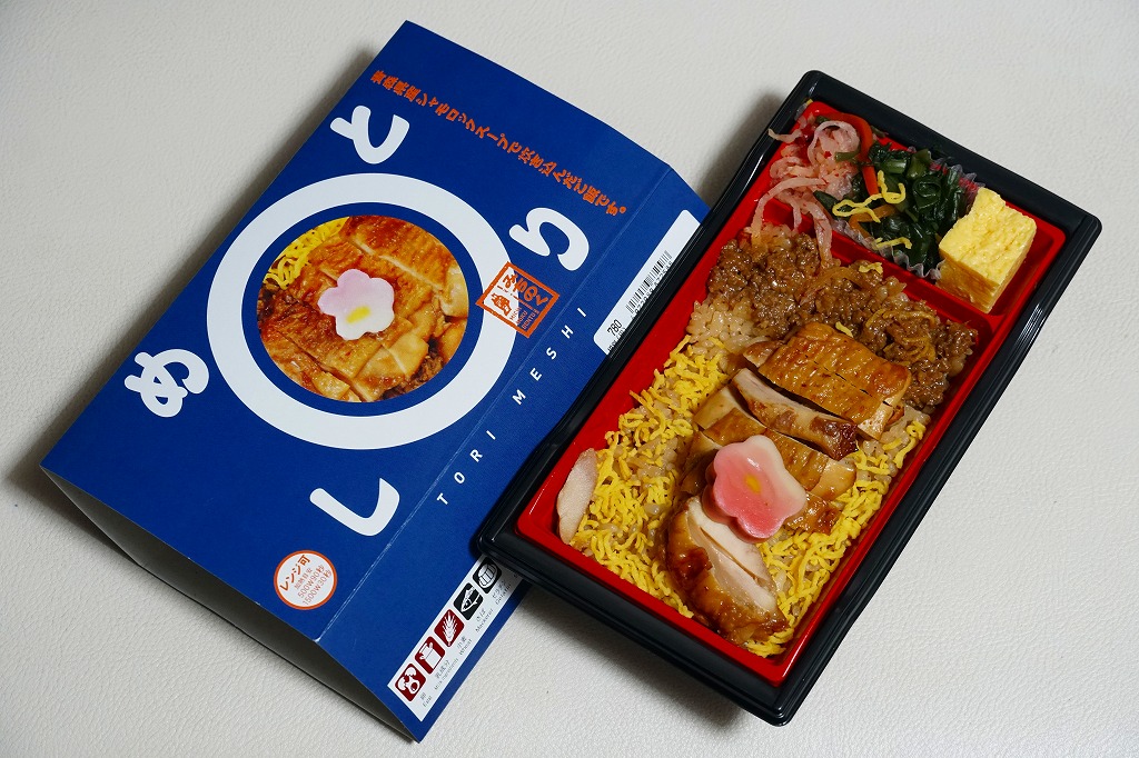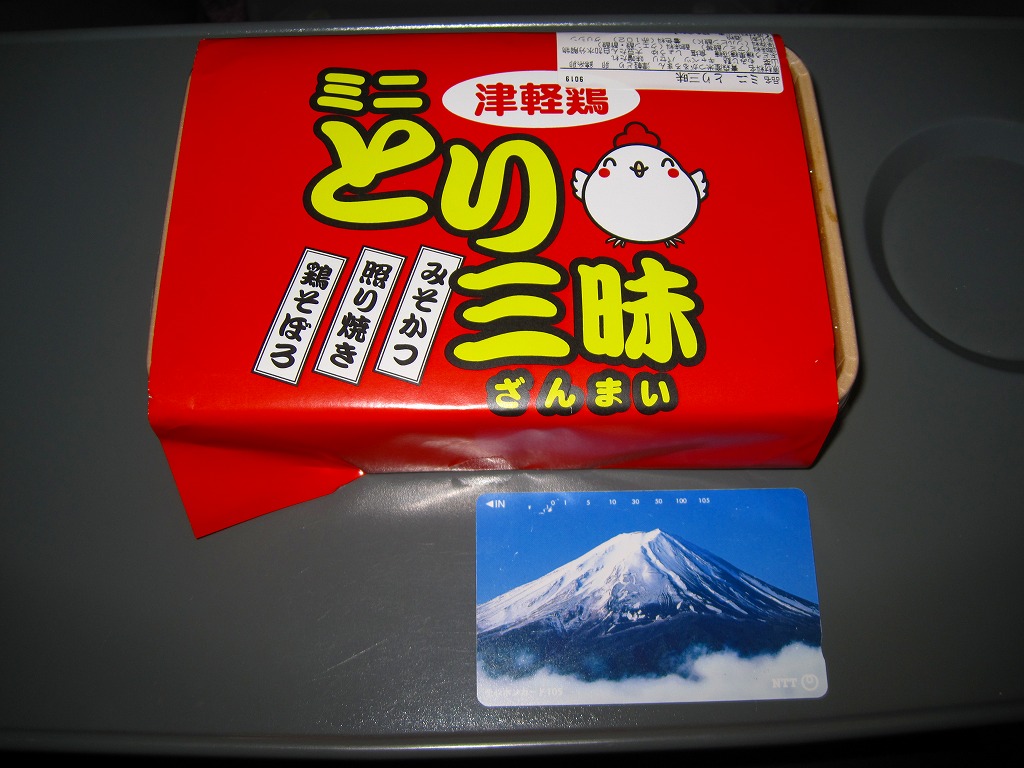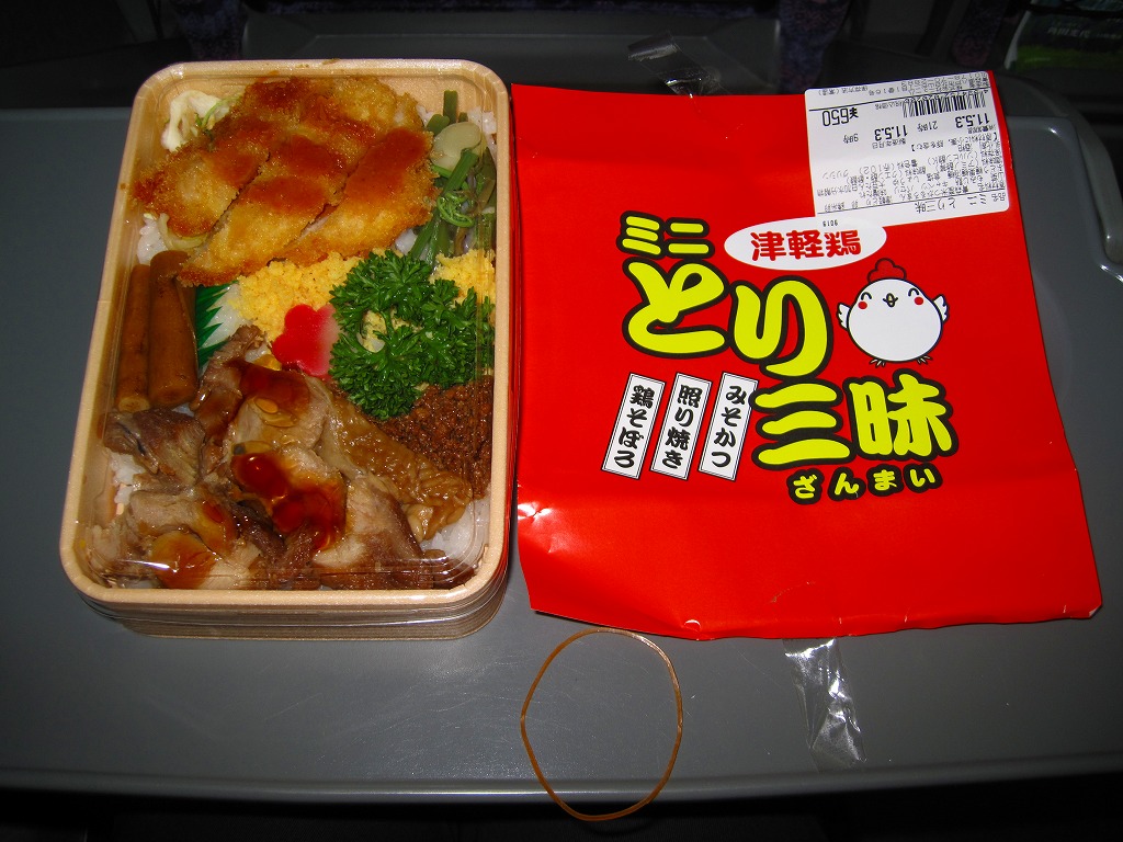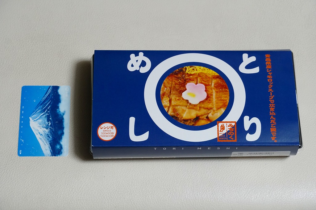 四角いプラ容器を収める青いスリーブに、商品名と円形の中身写真を記す姿は、それらのすべてに共通する。中身は、青森県産シャモロックの鶏ガラスープで炊いたという醤油飯を、錦糸卵と鶏照焼と鶏そぼろで覆い、玉子焼とわさび菜と大根漬を添えるもの。調製元は新青森駅の駅弁屋で、青森にちなむ食材が使われるようだが、青森の雰囲気が感じられない、だから岩手で買えても違和感のない、属地性不詳なお弁当。