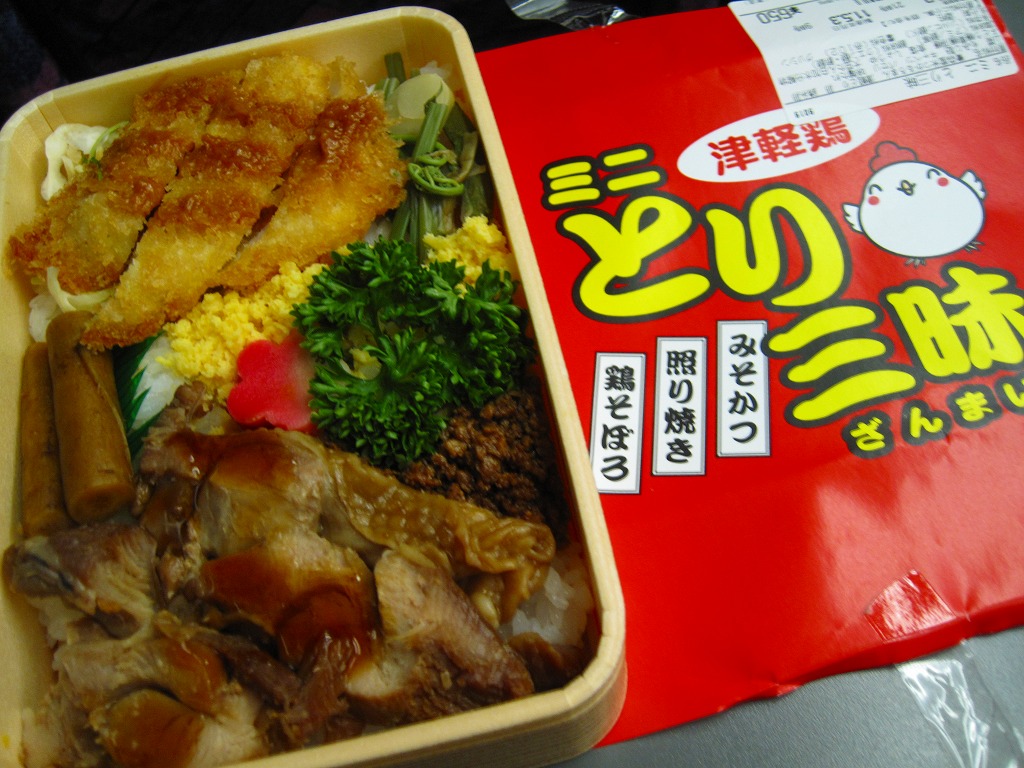 2013(平成25)年の夏までに発売か。スリーブに記されるとおり、青森県産牛のカルビ焼、青森県産桜姫鳥の塩照り焼、青森県産ガーリック豚のみそ焼が、それぞれ1区画ずつ丼ものになっている、牛と鶏と豚の肉駅弁。味付けに青森が誇る焼肉のたれ「スタミナ源たれ」を使用したという。