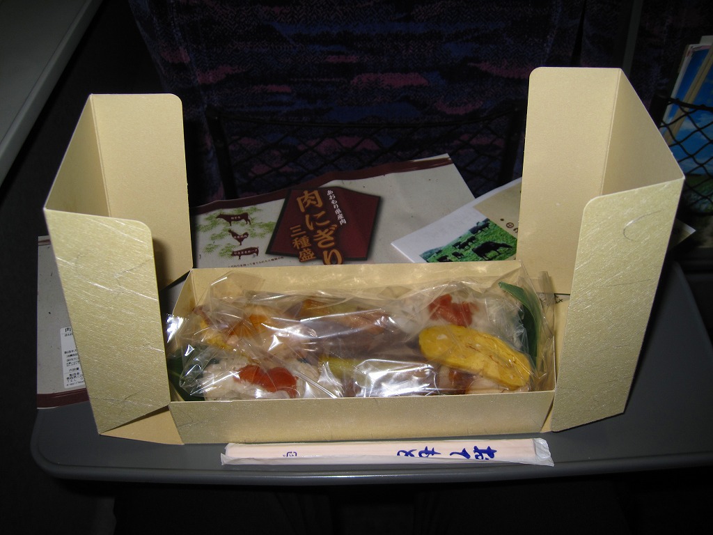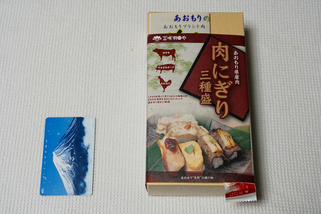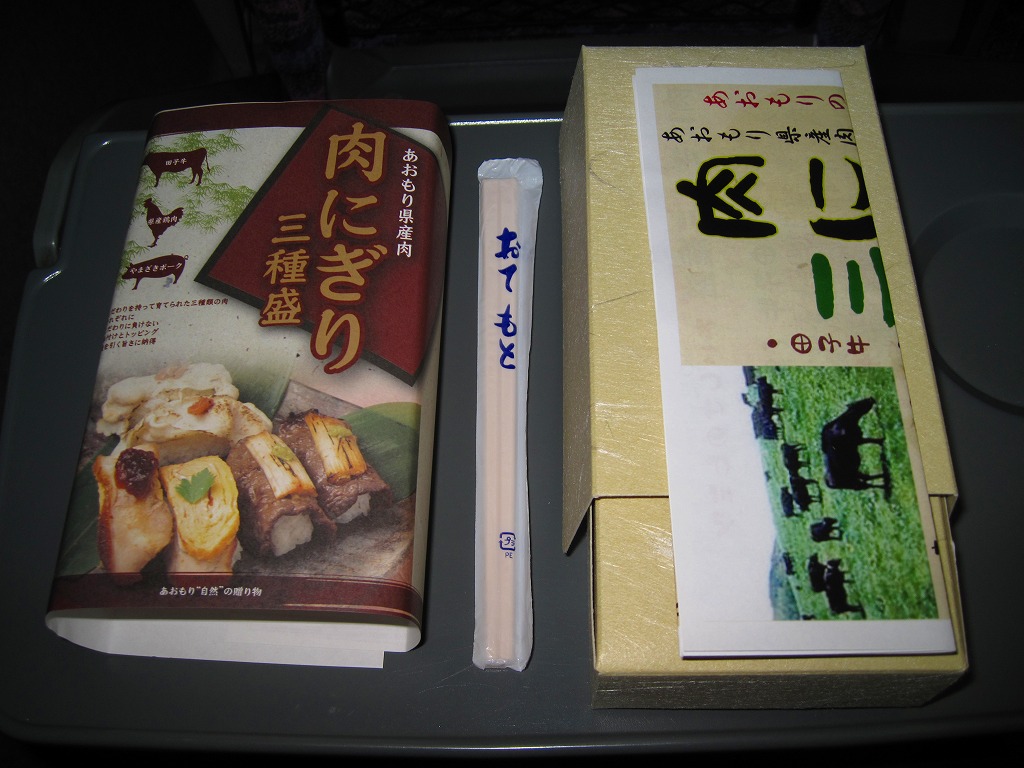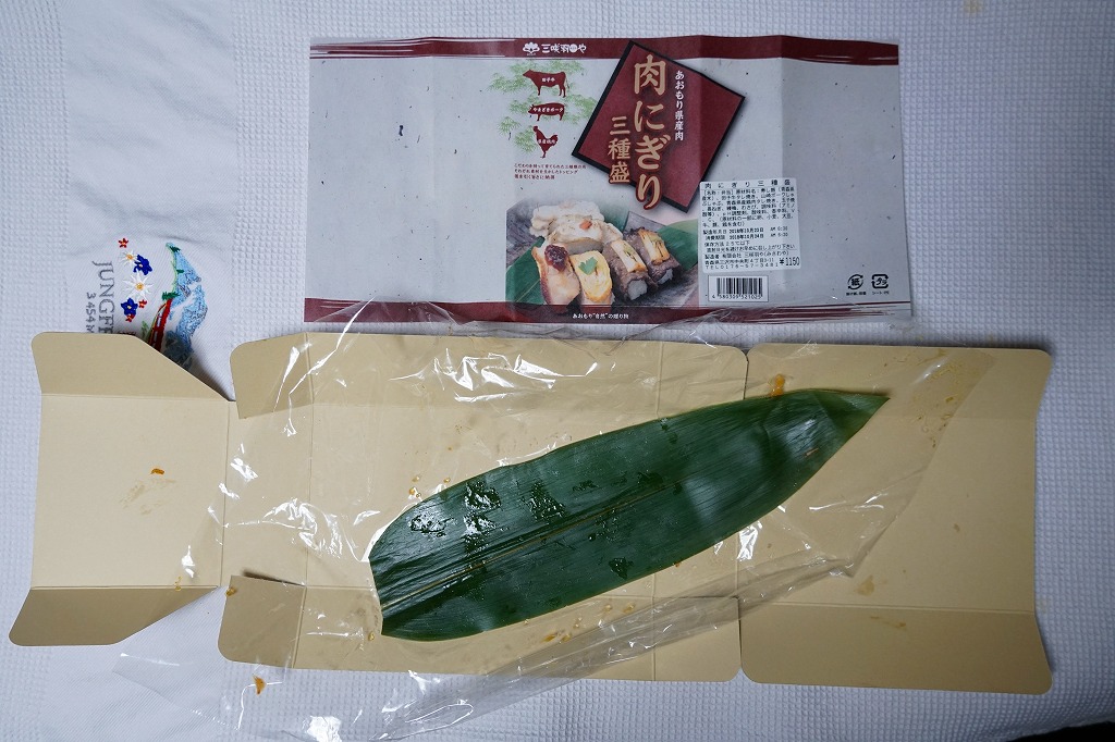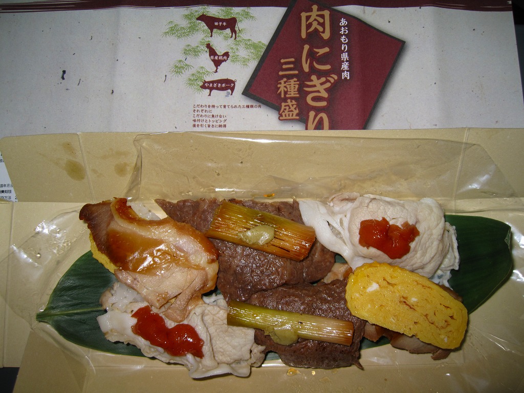 2010(平成22)年12月4日の東北新幹線全線開業に向けて開発し、新青森駅などで発売か。和紙風の表面加工をしたボール紙の容器に、中身の写真と商品名などを印刷した掛紙を巻く。中身は焼ネギとワサビを載せた田子牛の牛焼肉、玉子焼を載せた県産鶏肉の鶏照焼、梅肉ソースを載せたやまざきポークの豚しゃぶを、それぞれ握り飯と合わせたもの。にぎり寿司のようで食べやすく、肉はうまく、創作料理の雰囲気を程良く感じる。価格は2018年の購入時で1,150円、2020年時点で1,300円、2024年時点で1,350円、2025年時点で1,490円。